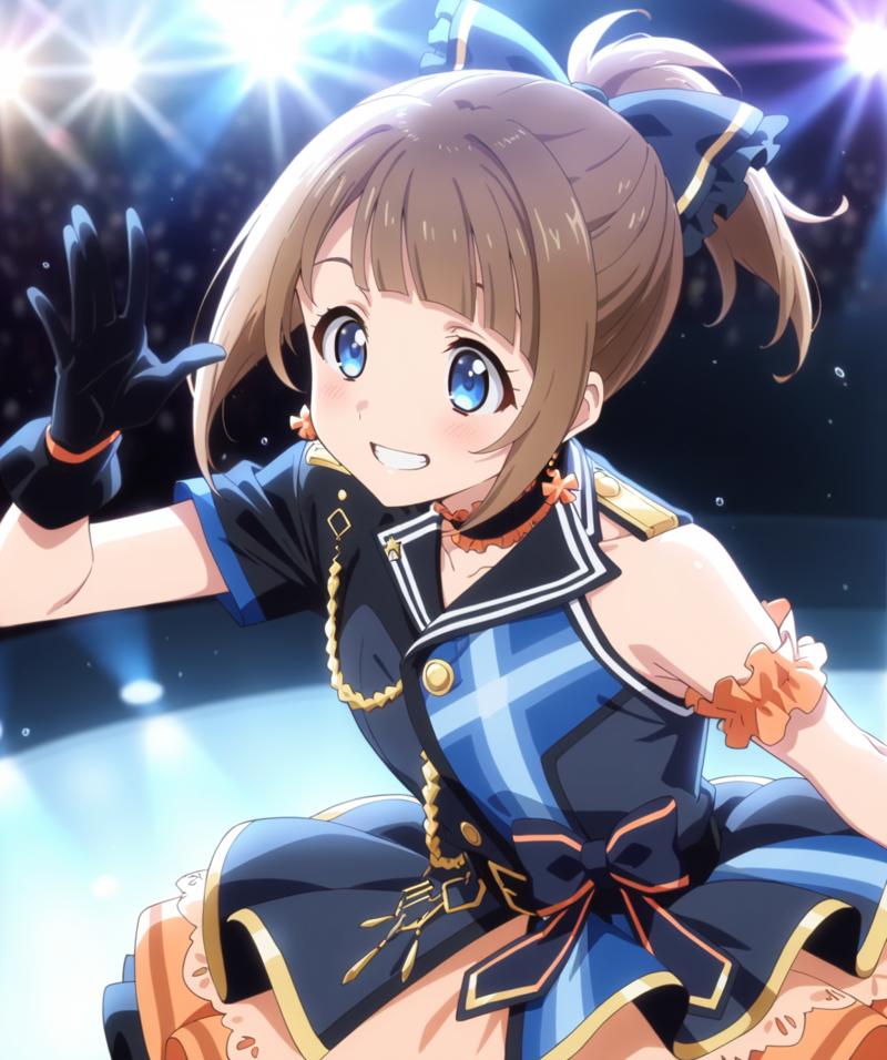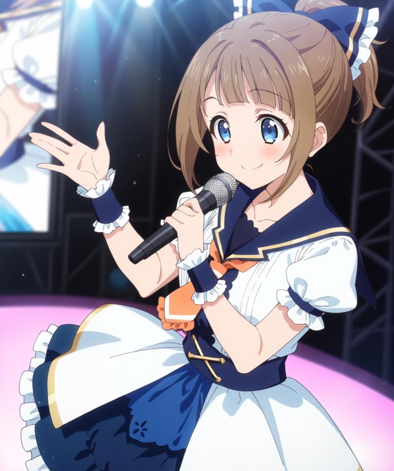 idol costume1, blue hair bow, white dress, puffy short sleeves, blue sailor collar, orange tie, blue belt, blue skirt, blue socks, white shoes,