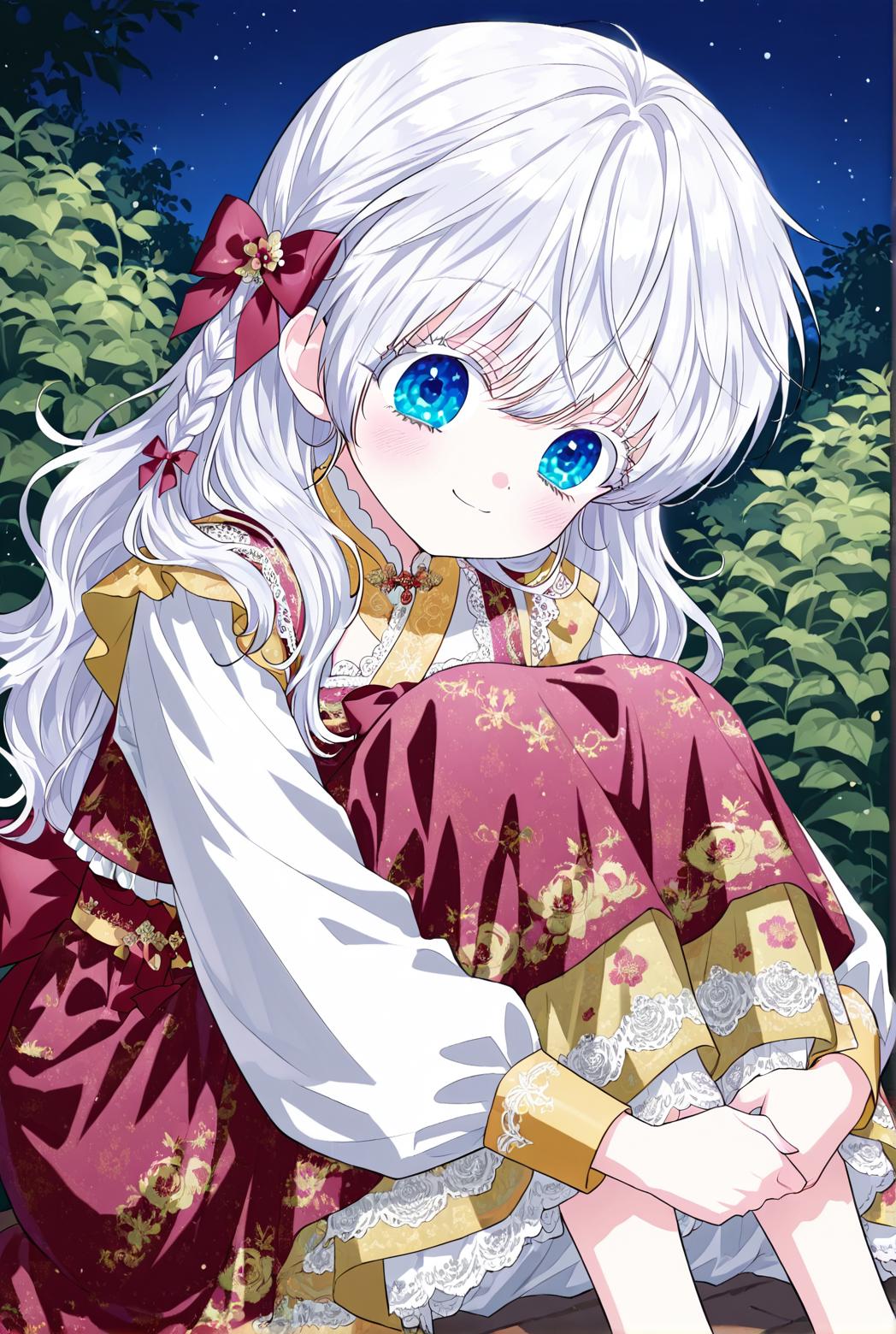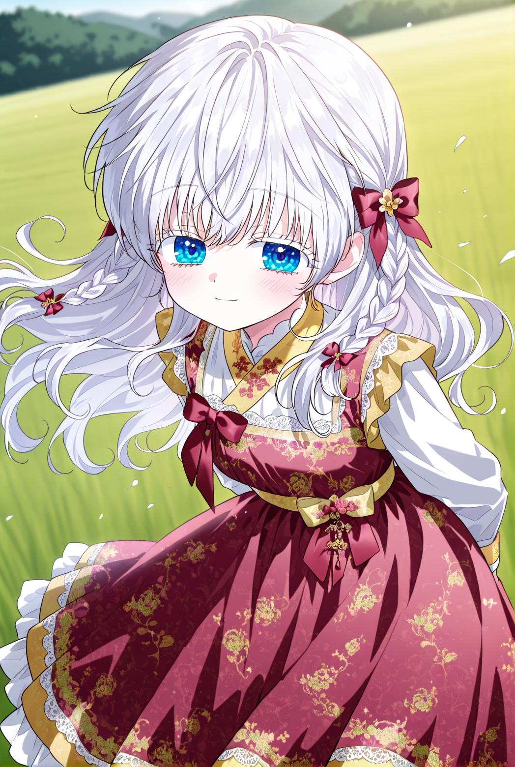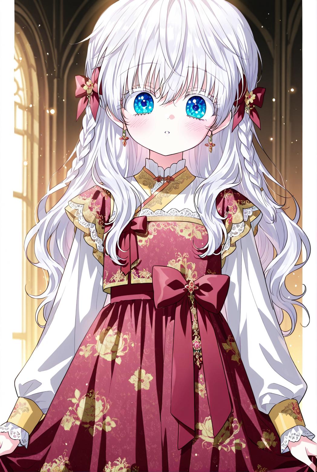 Lili, 1 girl, solo, small stature, white hair, long hair, wavy hair, side braids, twin braids, blue eyes, sparkly eyes, red ribbon bows, flower hair ornaments, gold and red hair ornaments, ribbon decorations,