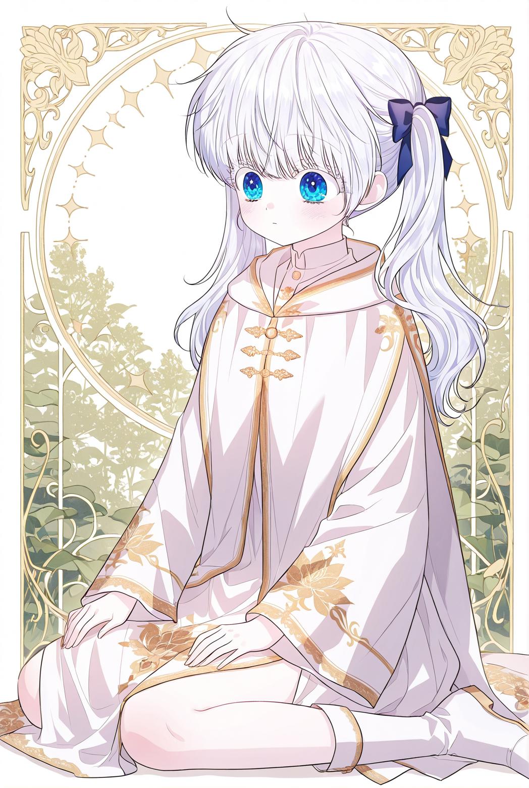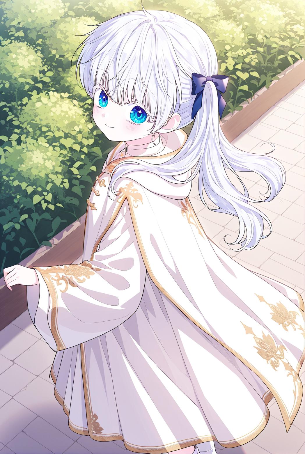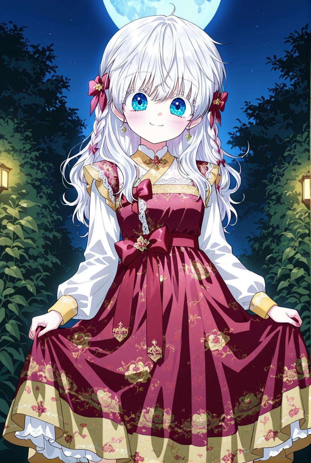 Lili, 1 girl, solo, small stature, white hair, long hair, wavy hair, side braids, twin braids, blue eyes, sparkly eyes, red ribbon bows, flower hair ornaments, gold and red hair ornaments, ribbon decorations,