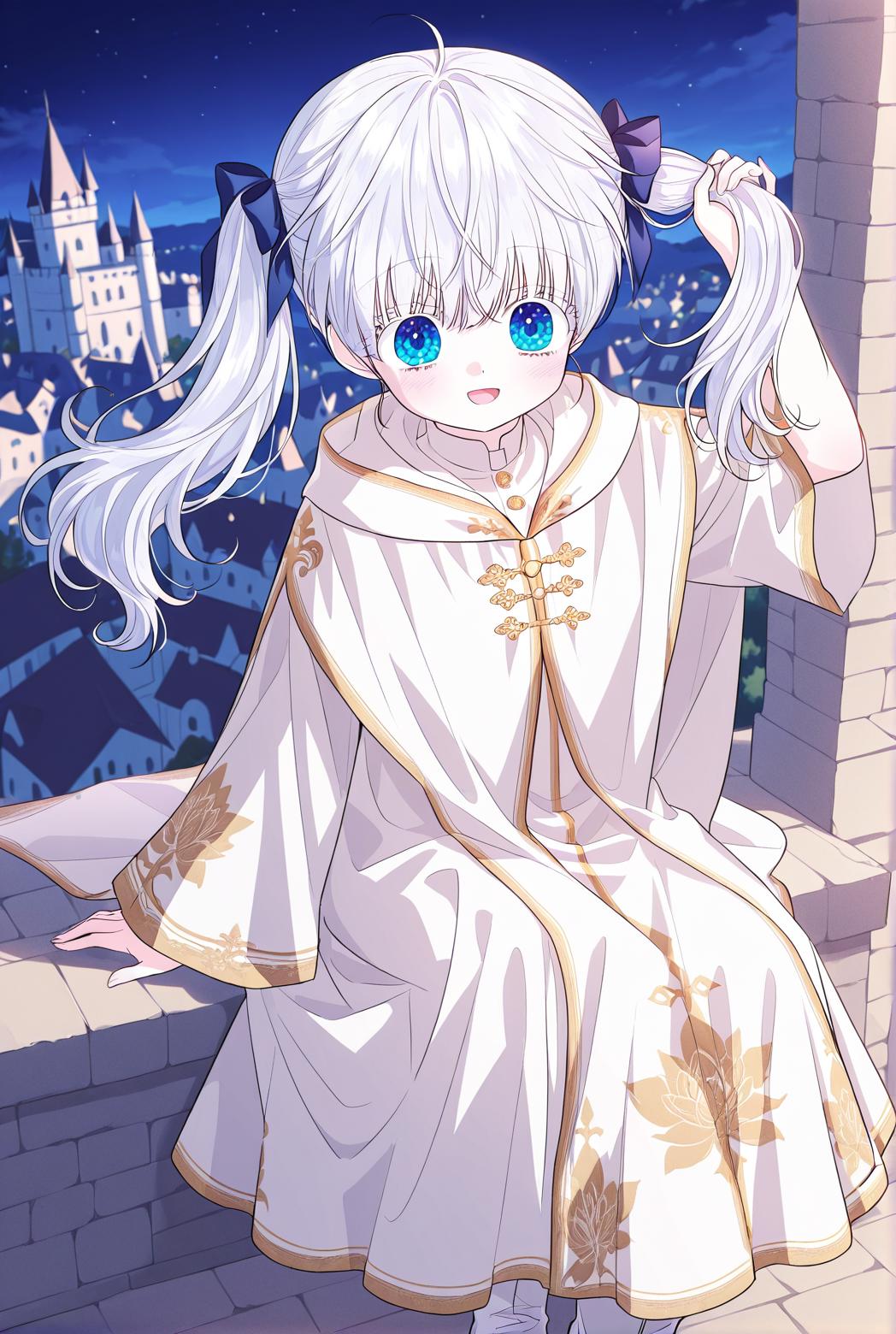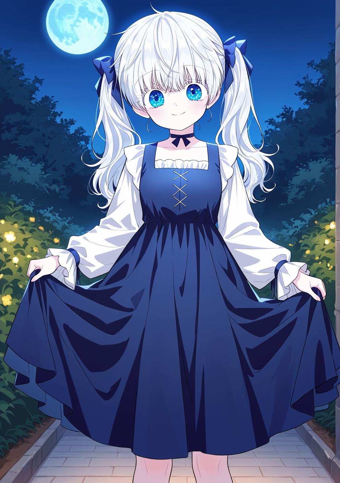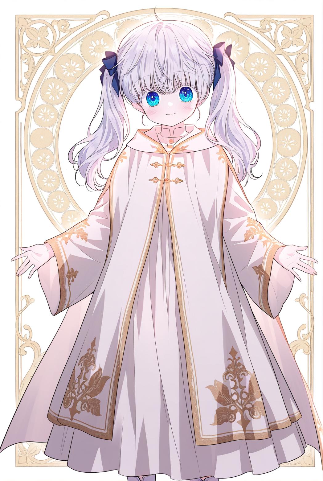 Lili, 1 girl, solo, small stature, pale skin, blue eyes, sparkly eyes, white hair, long hair, twintails, blunt bangs, loose strands, blue hair bows, blue ribbon hair bows, loose long twintails,