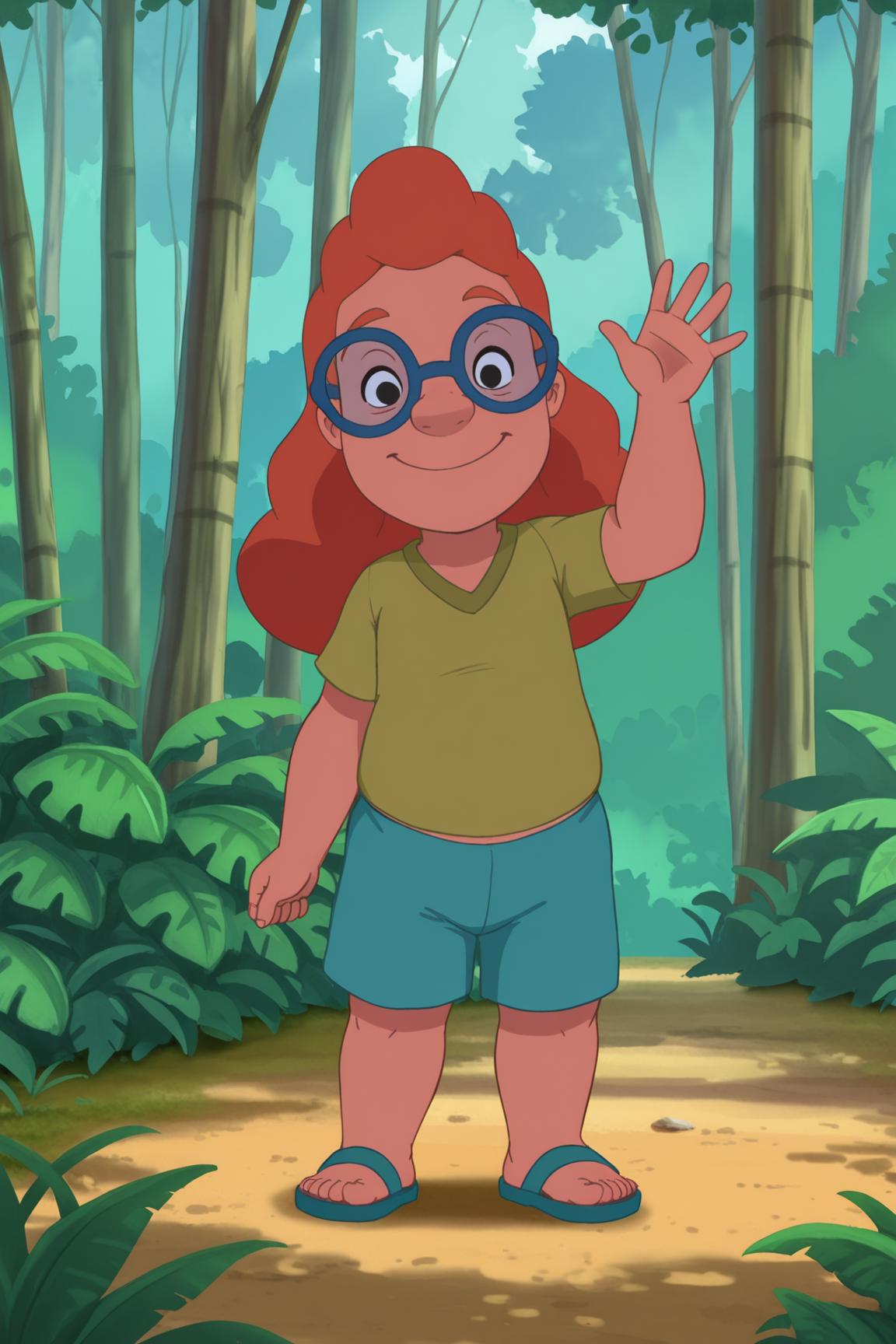 ➜ MertleEdmonsLSILXL, black eyes, orange hair, long hair, blue glasses, flat chest, green shirt, short sleeves, turquoise shorts, turquoise sandals