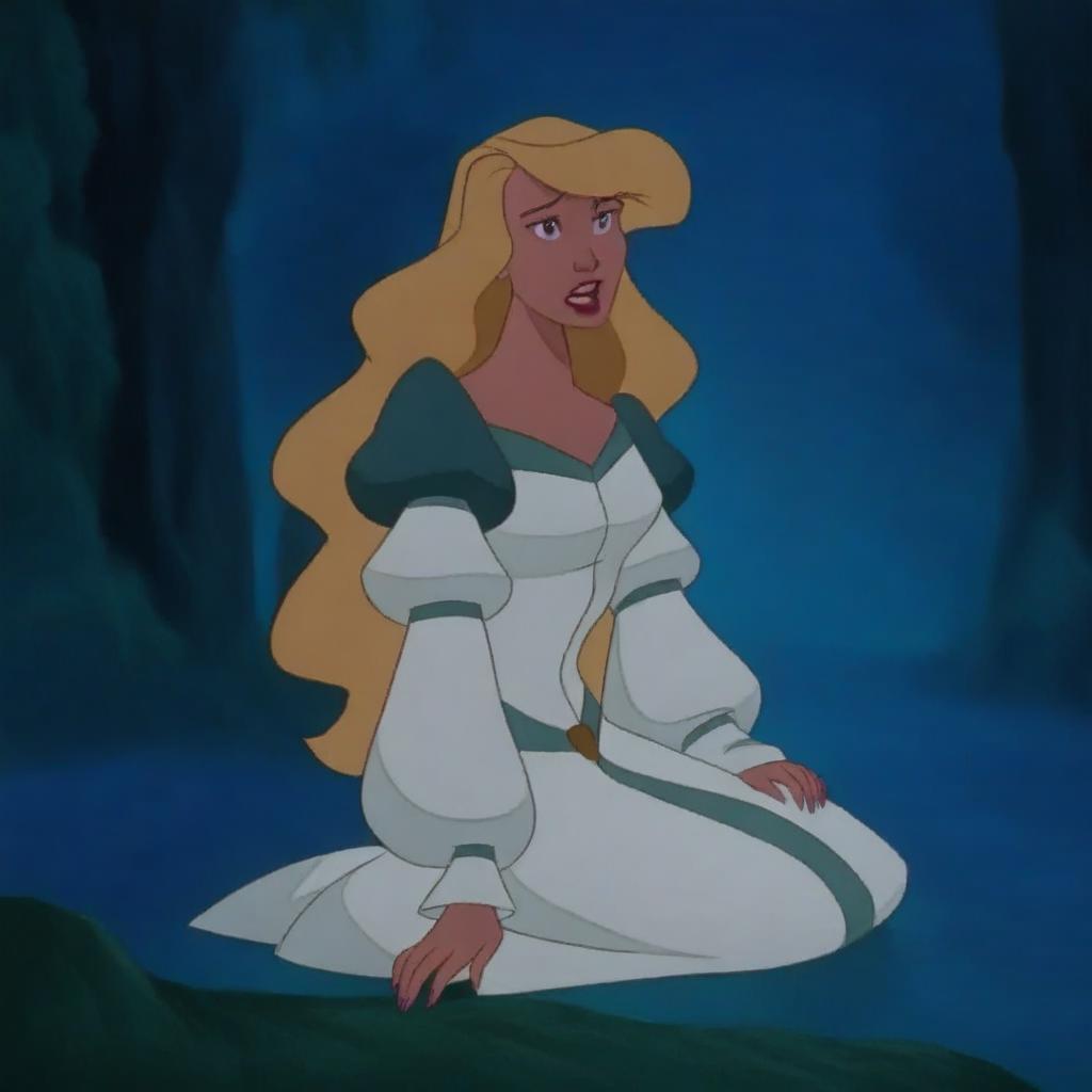 ZZOdette, cartoon, screencap, 2d, white dress long puffed sleeves with blue lining, blonde hair, is long blonde hair, wavy long blonde hair, purple eyes