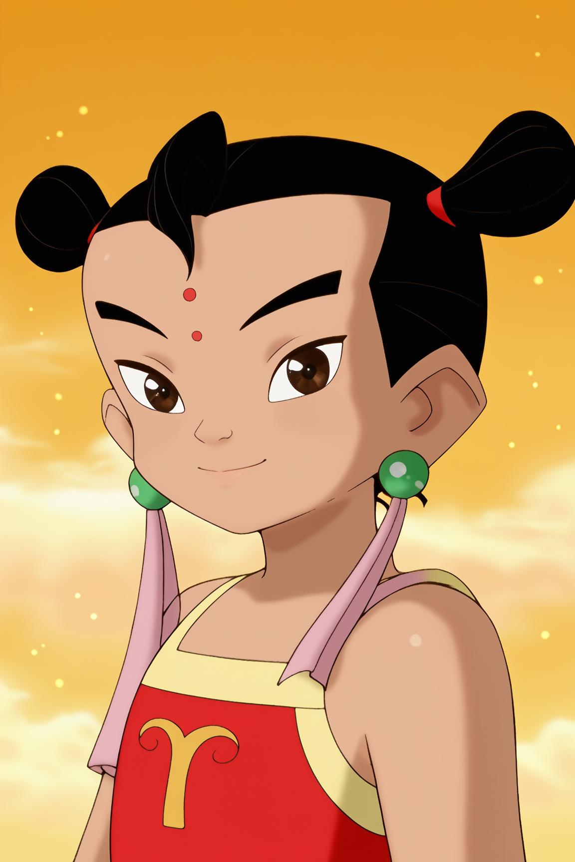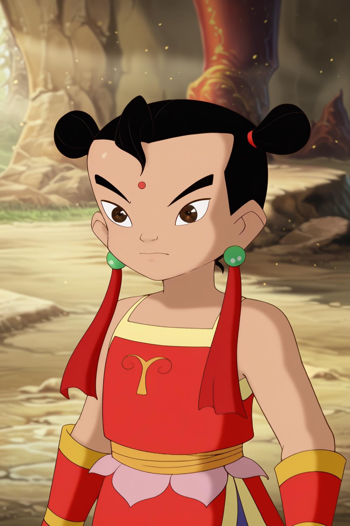 nezha, black hair, brown eyes, earrings, forehead mark,