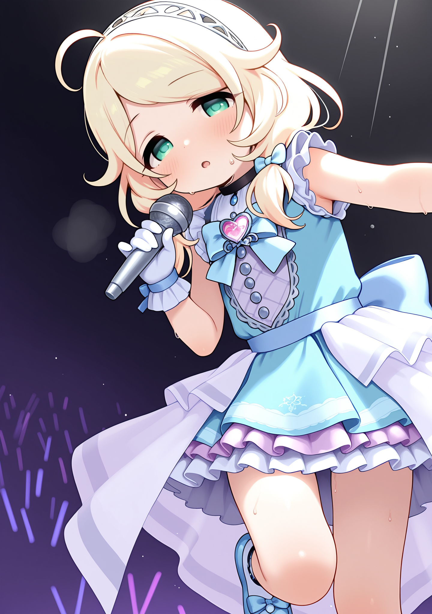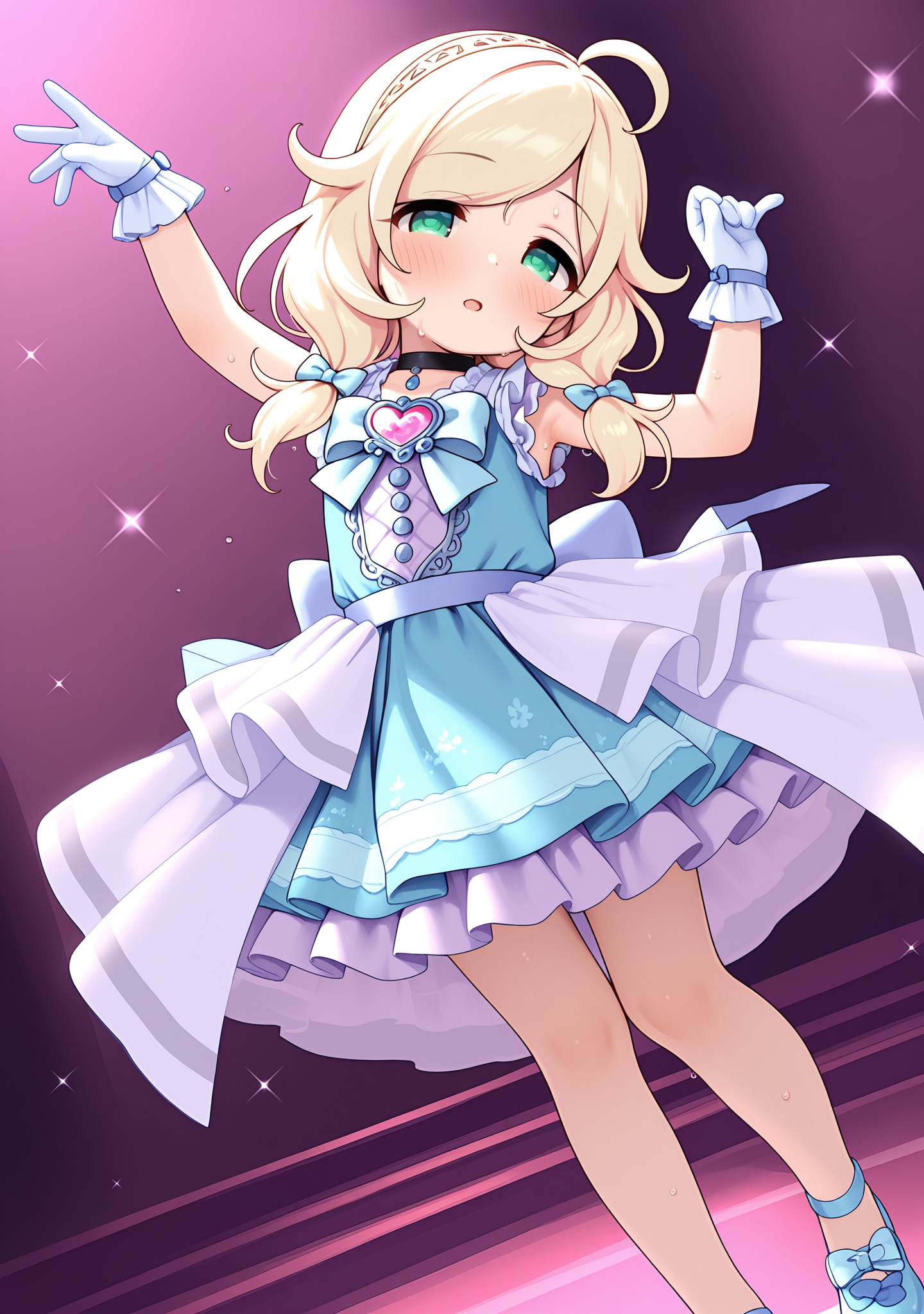 blue dress,blue bowtie,blue bow,blue gemstone,white gloves,multicolored dress,two-tone dress,frilled gloves,hairband,back bow,sleeveless dress,blue shoes,layered frilled skirt,white frilled skirt,purple frilled skirt,see-through white long overskirt,black choker,pink heart brooch