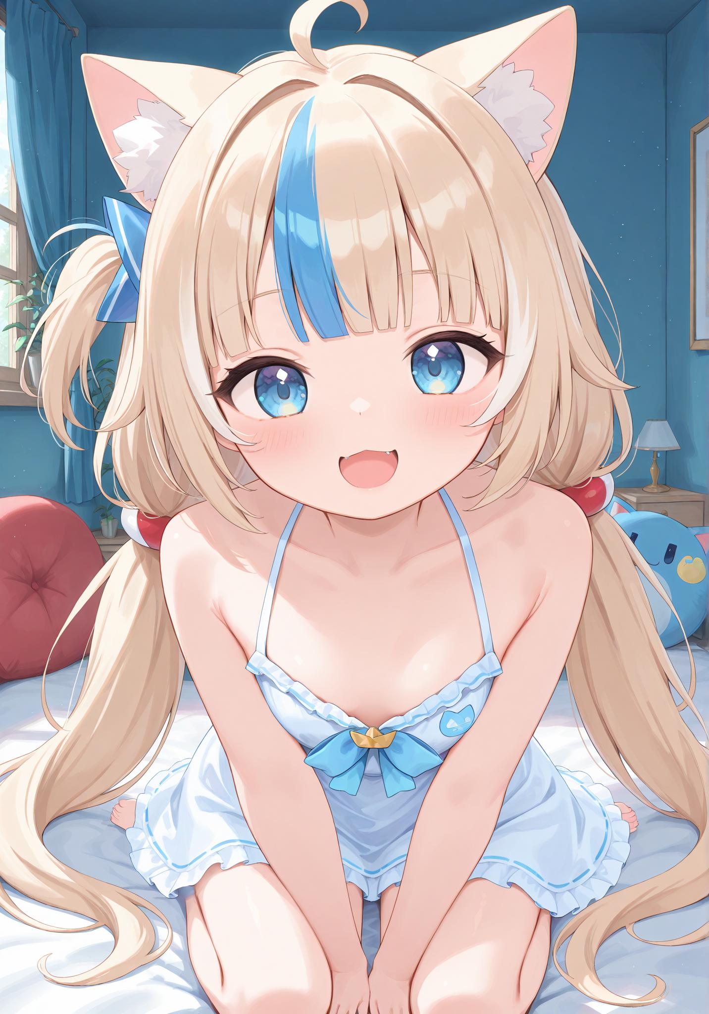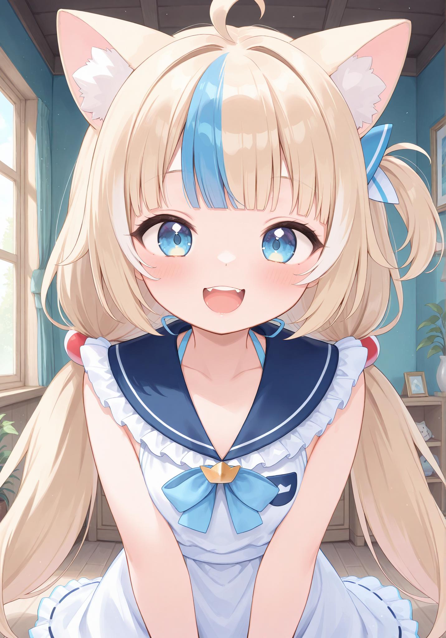 tags:1girl,cat ears,twintails,one side up,long hair,ahoge,blue eyes,multicolored hair,streaked hair,blue hair,blonde hair,blunt bangs
