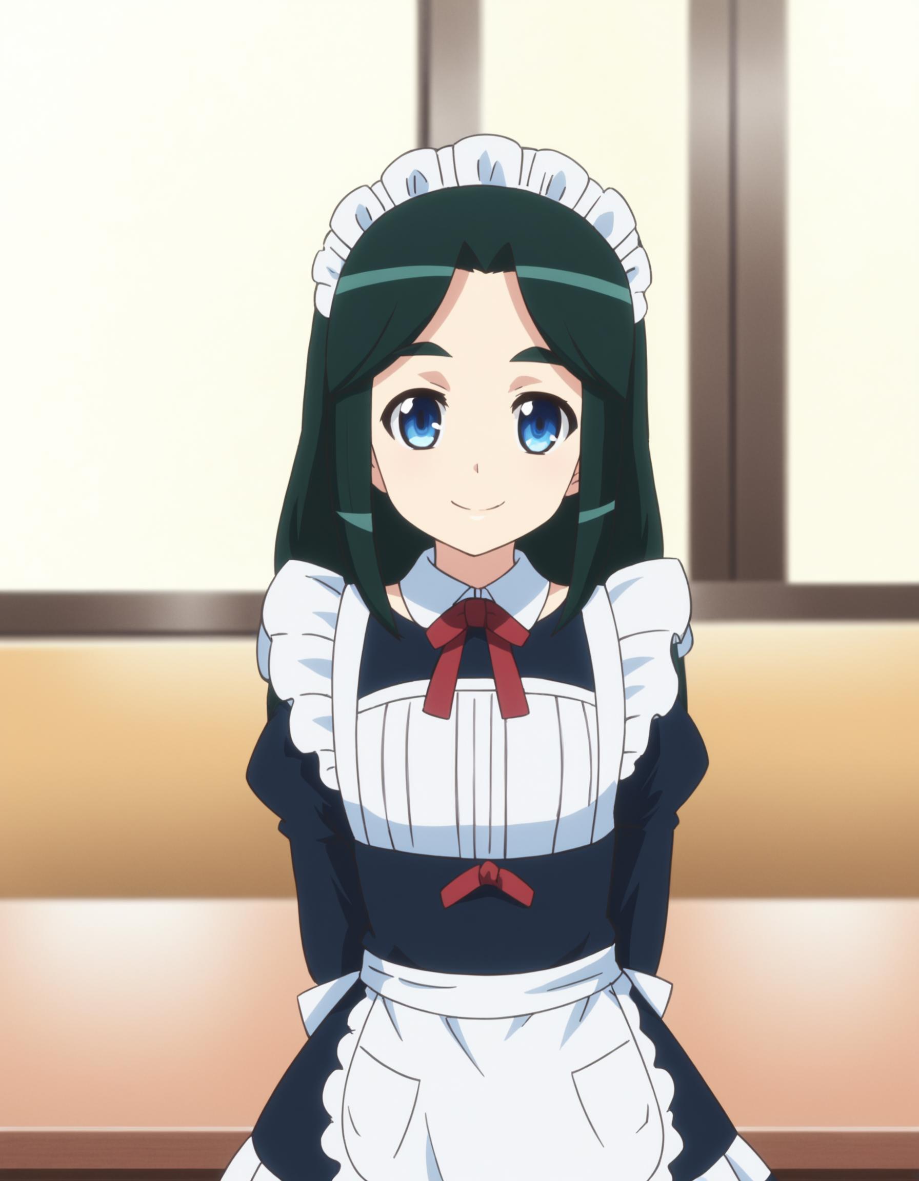 Default Outfit:blue_eyes, green_hair, long_hair, white_headband, crown, orange_kimono, long_sleeves, wide_sleeves, obi, white_sash, hakama_skirt, blue_skirt