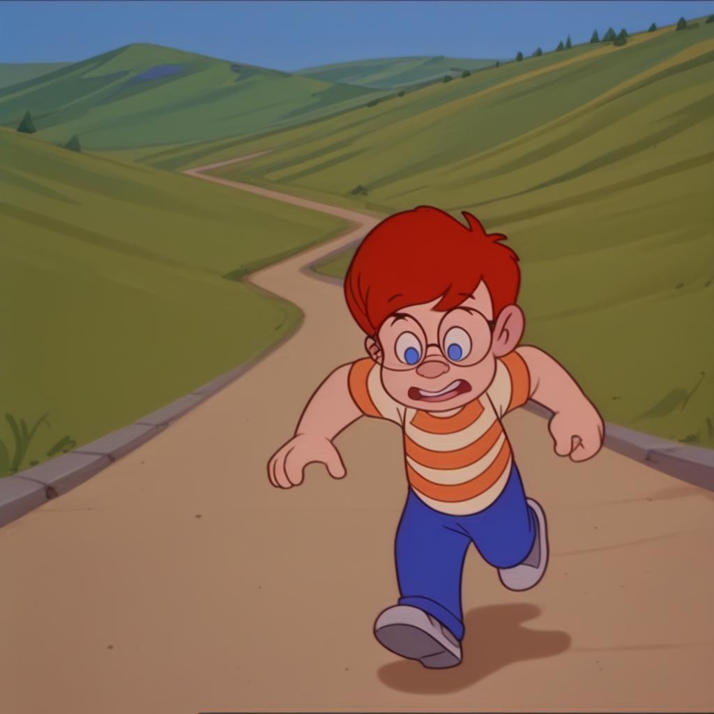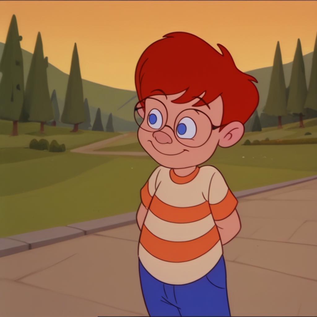 solo, 1boy, male focus, young_masterrob, red hair, blue eyes, glasses, striped shirt, blue pants