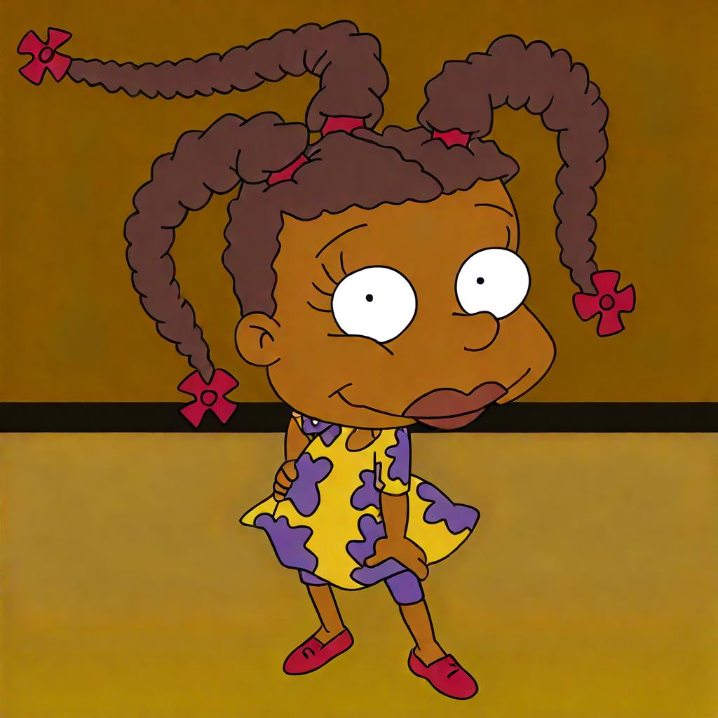 Susie,dark skin,triple braids,braid,brown hair,hair ornament,yellow and purple short-sleeved dress,purple leggings,red ballet flats