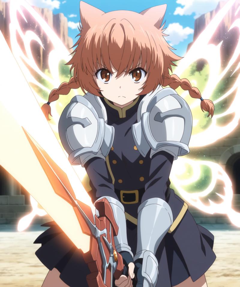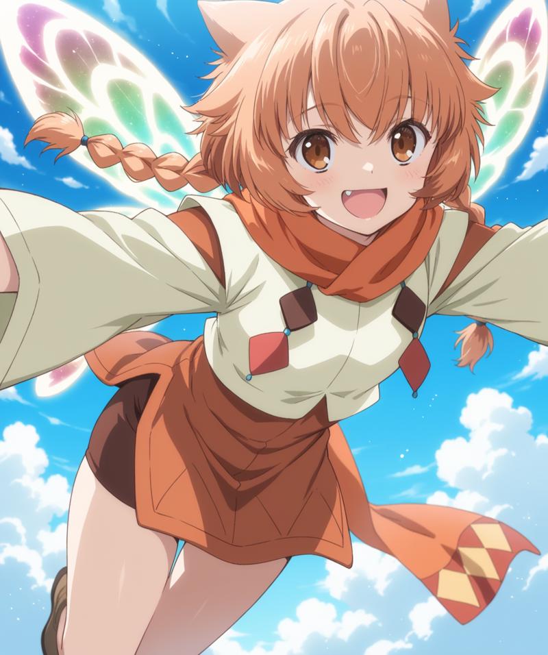 ithea, brown eyes, orange hair, long hair, animal ears style hair, triple braids, double teeth,