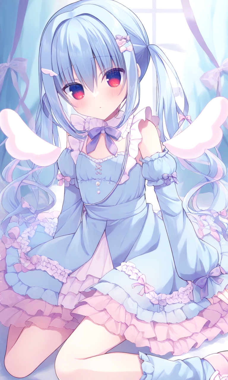 outfit2:amami kurine,red eyes, light-blue dress,purple bow, frilly dress,pink bow, light-pink accents,light blue hair, twintails, decorative bows,light-blue socks,pink bows,light pink rufflet, angel wings, flat chest,hair clip, short over long sleeves, puffy sleeves, detached sleeves, pink shoes,