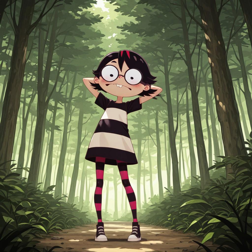 lottie_fc, black hair, streaked hair, glasses, buck teeth, dress, striped pantyhose