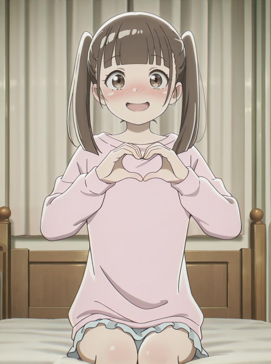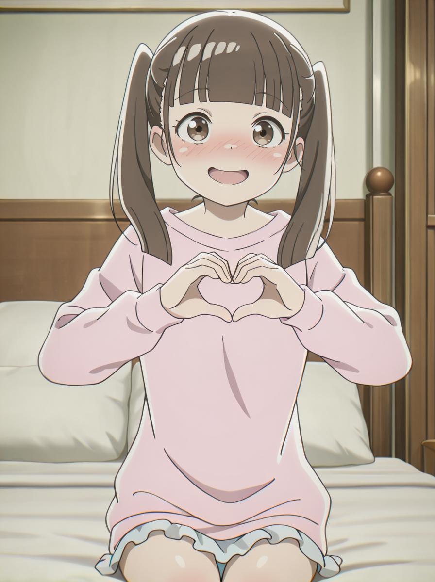 Main Look: rintamakiillust, twintails, brown hair, 1girl, brown eyes, bangs, blunt bangs pink shirt