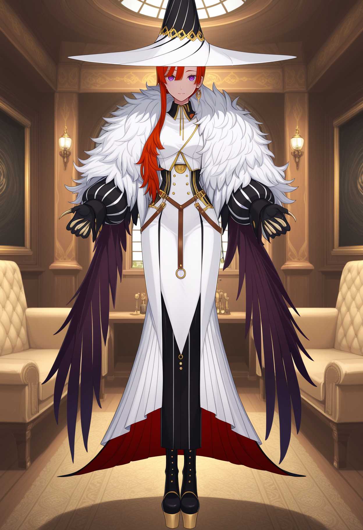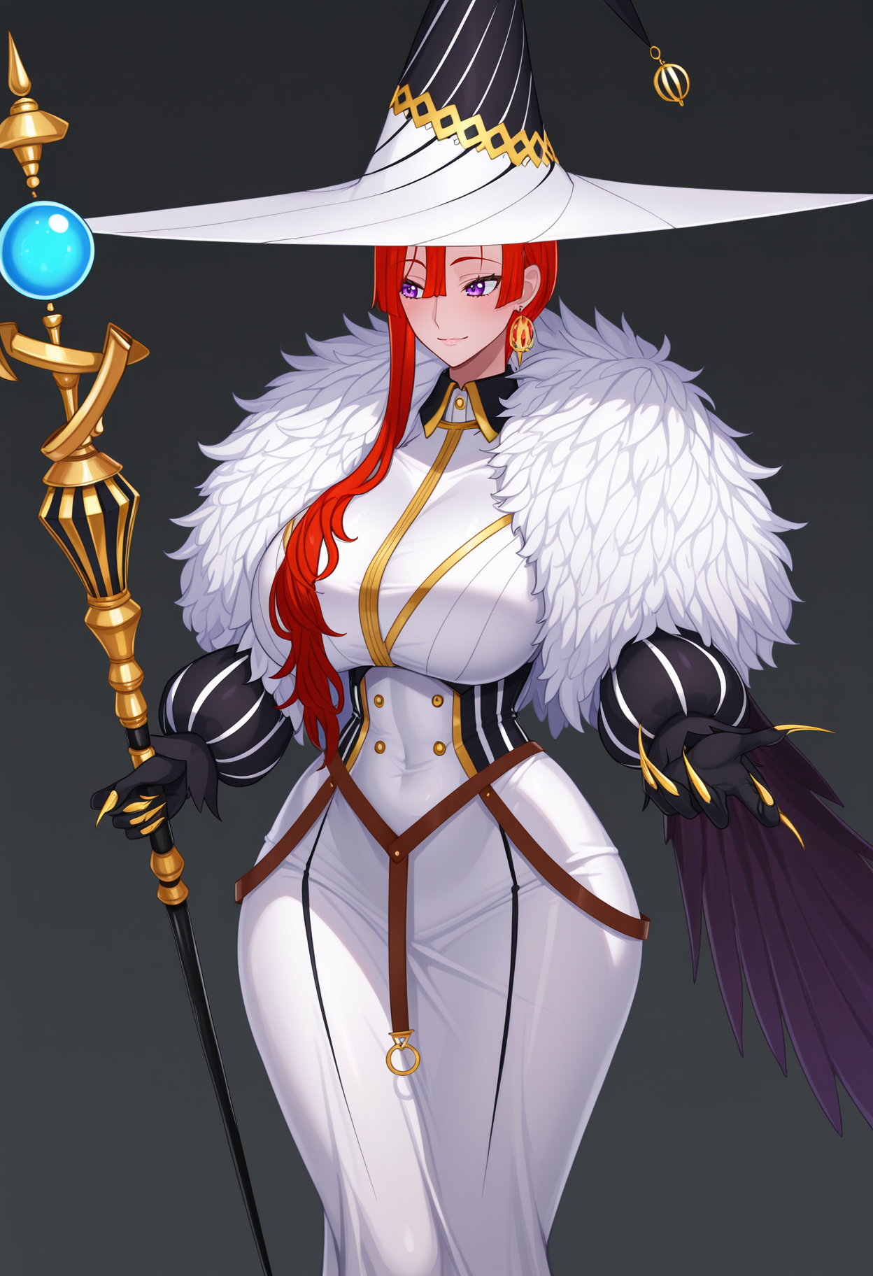 sa, red hair, purple eyes, witch hat, jewelry, earrings, gold trim, feather boa, white dress, layered dress, finger claws, platform boots,