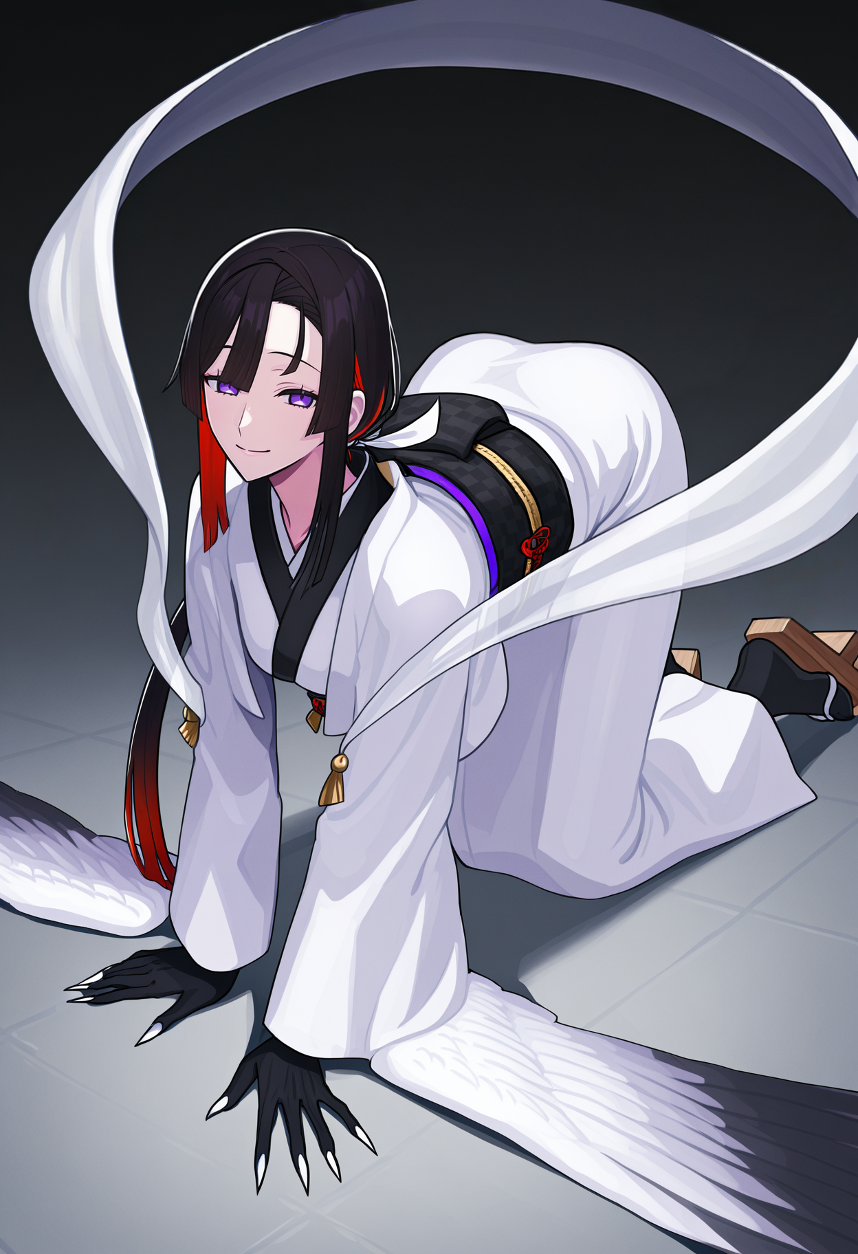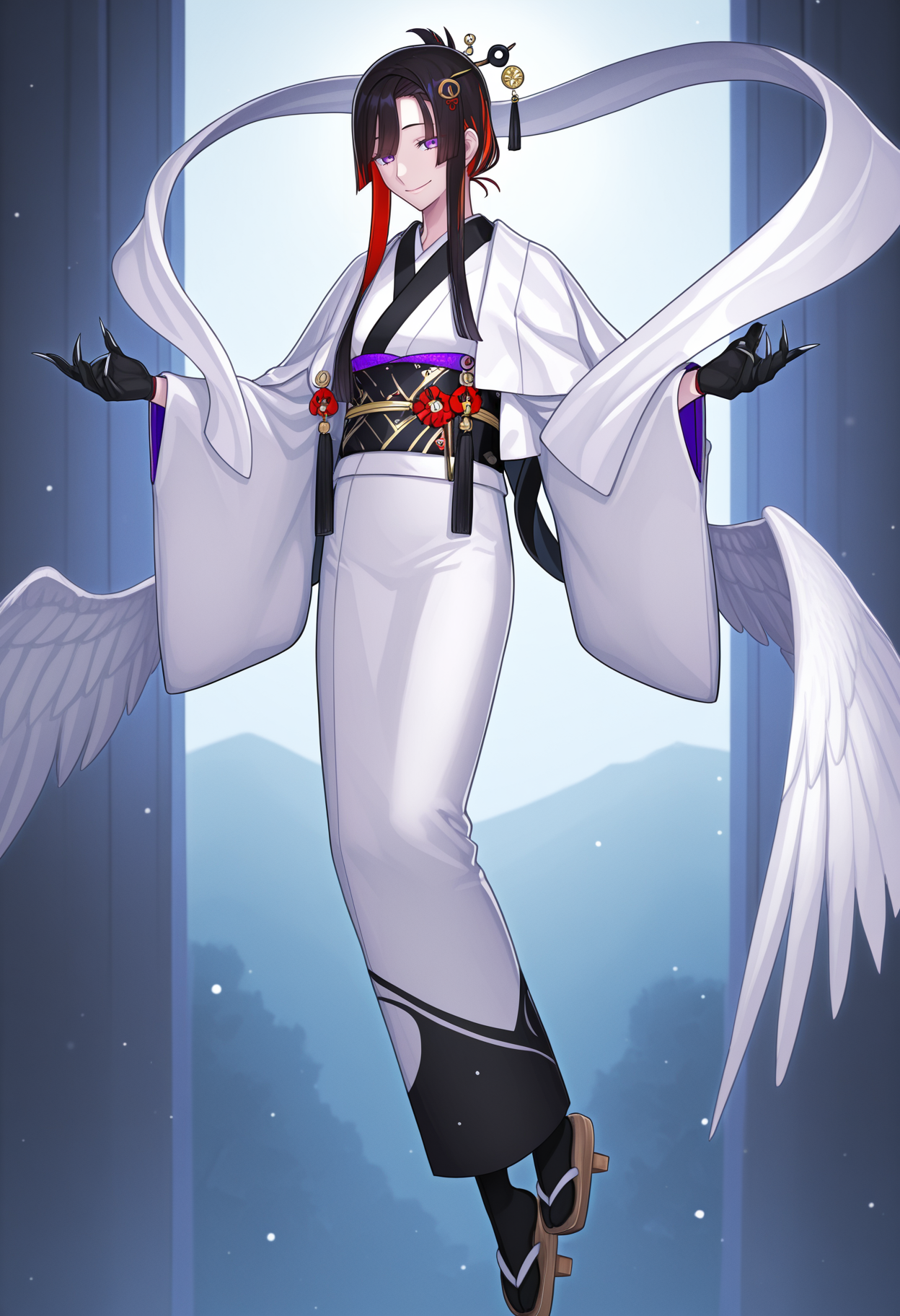 ta, purple eyes, multicolored hair, black hair, red hair, low ponytail, hair ribbon, japanese clothes, obi, black gloves, finger claws, white wings, shawl, tassel, black socks, geta, hagoromo,
