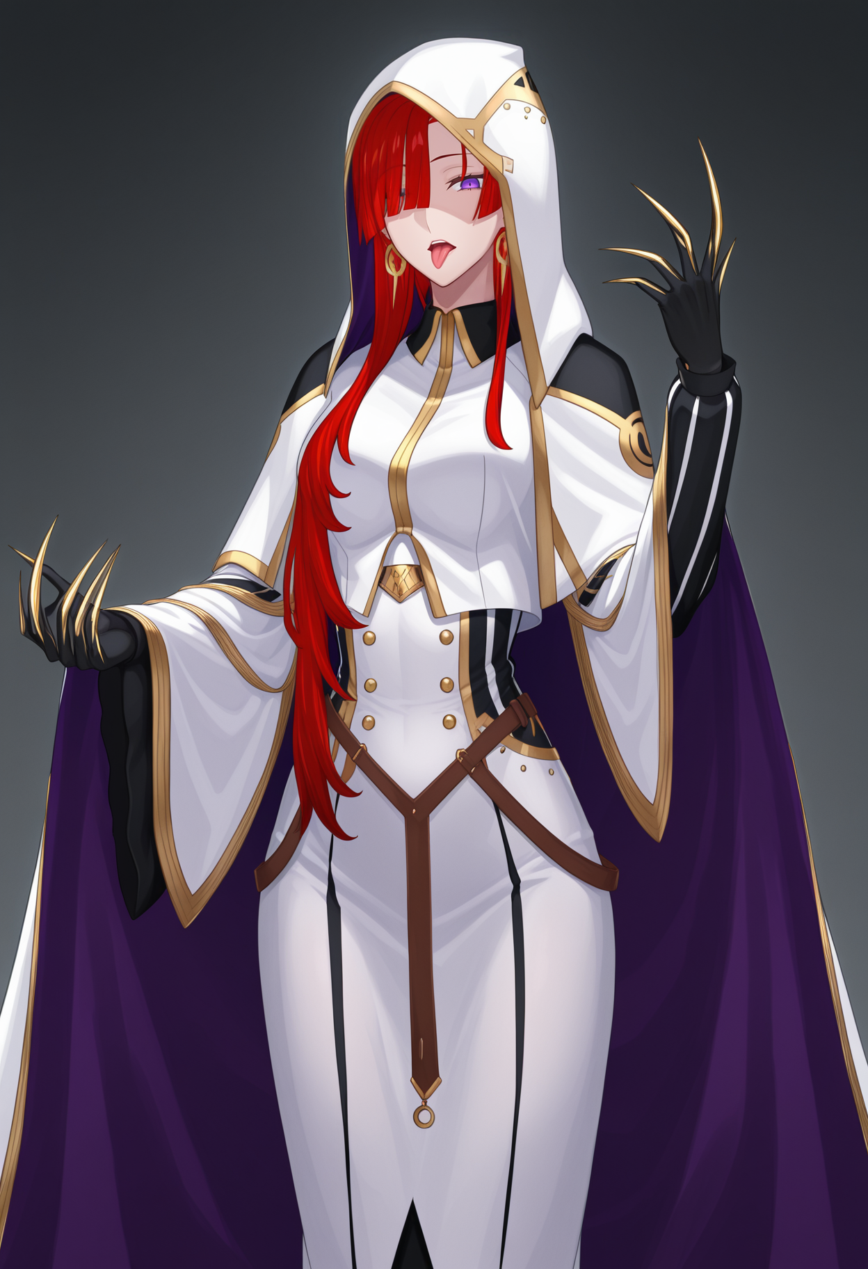 fa, red hair, purple eyes, jewelry, earrings, hood, gold trim, white cape, layered dress, wide sleeves, black gloves, finger claws, red shawl, platform boots,