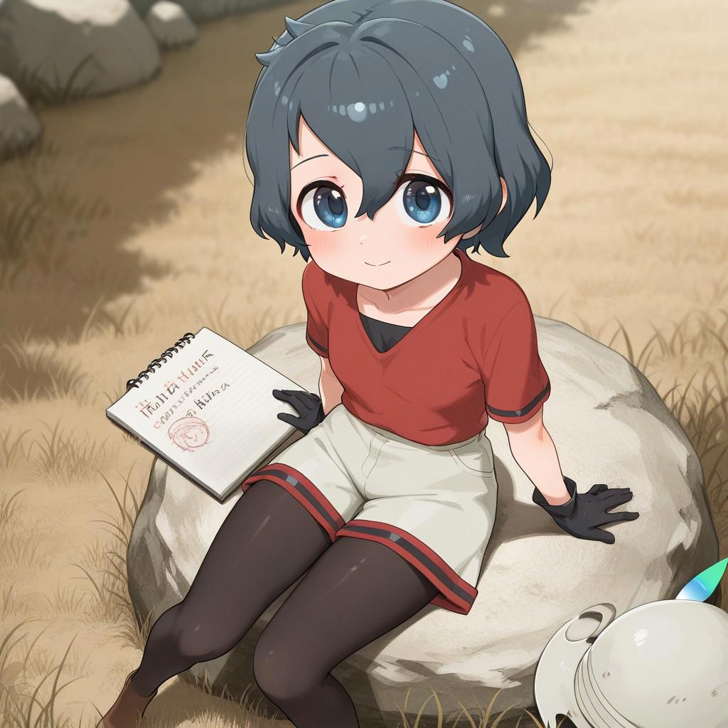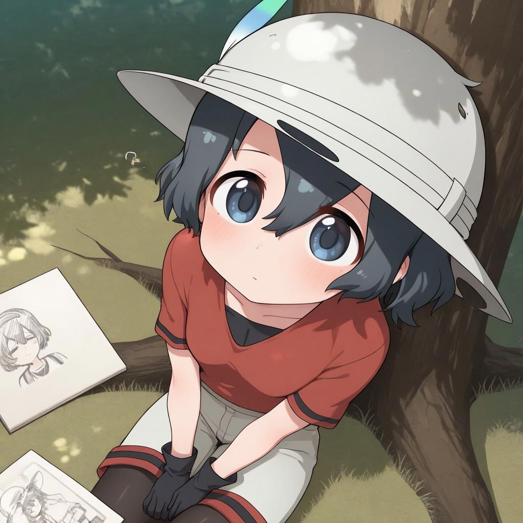black hair, blue eyes, pith helmet, red shirt, backpack, black gloves, shorts, black pantyhose, shoes,