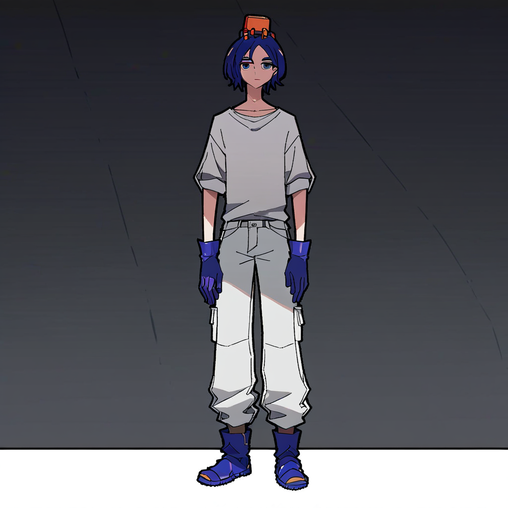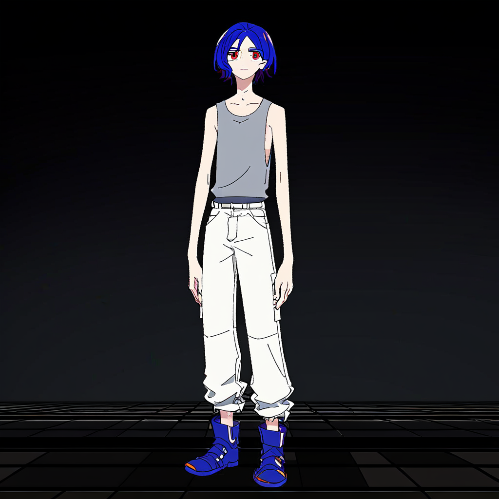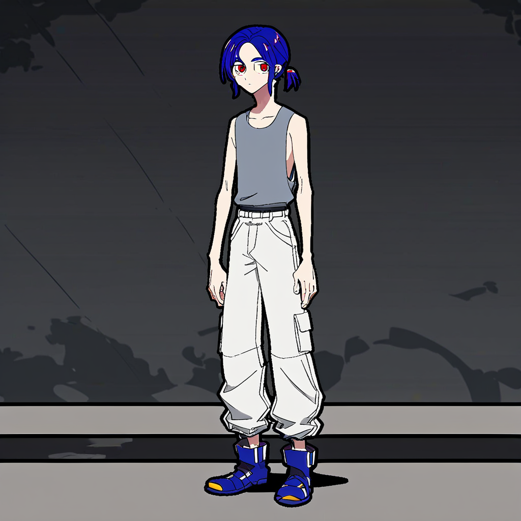 pants, white pants, grey pants, black footwear, tank top, grey shirt, shirt, sleeveless shirt, blue footwear, sleeveless, boots, shoes,