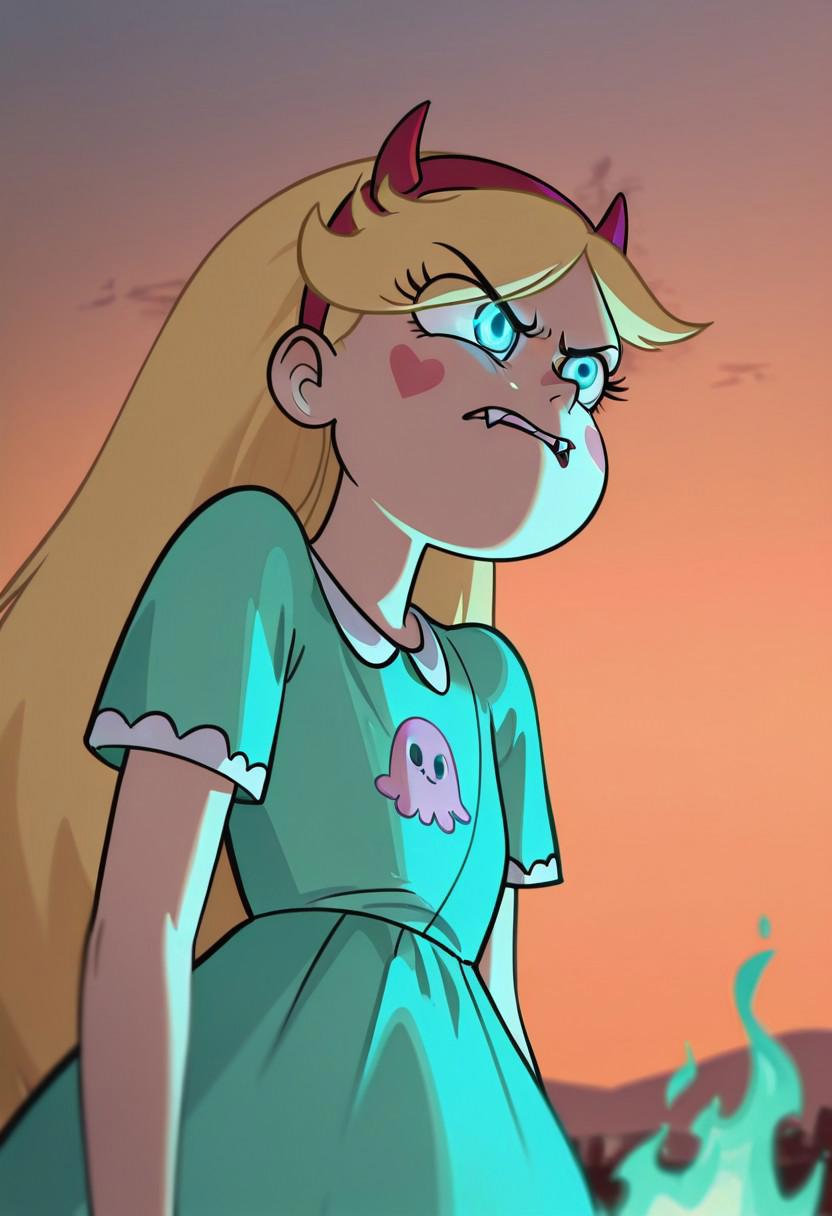 starbb, 1girl, long hair, blonde hair, red headband, little demon horns on headband, blue eyes, heart cheek marks, teal collared dress, short puff sleeves, lace trim hem, striped tights, pink and purple striped pantyhose, violet boots, eye design on boots, horn on boots, calarts art style, cartoon style,