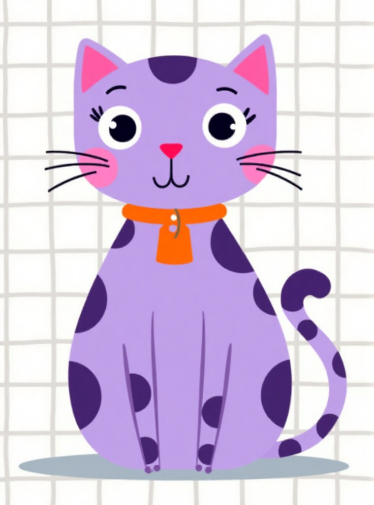 Cartoon - style illustration, a purple cat with spots, stretching on a tiled floor, cute and lively posture.