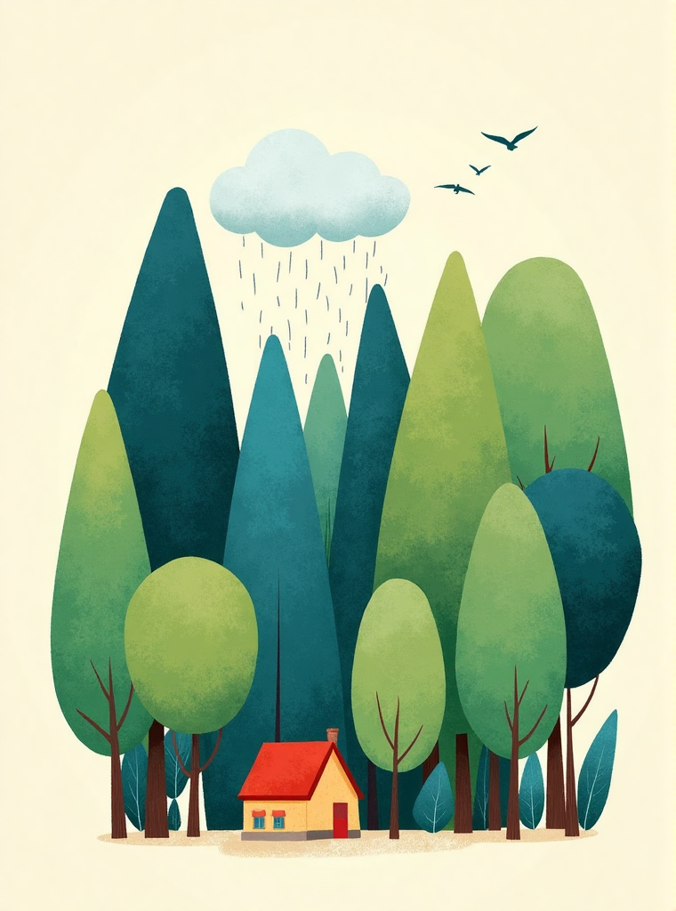 Cartoon - style illustration, a cluster of green plants, with a small white cloud, fresh and natural vibe.