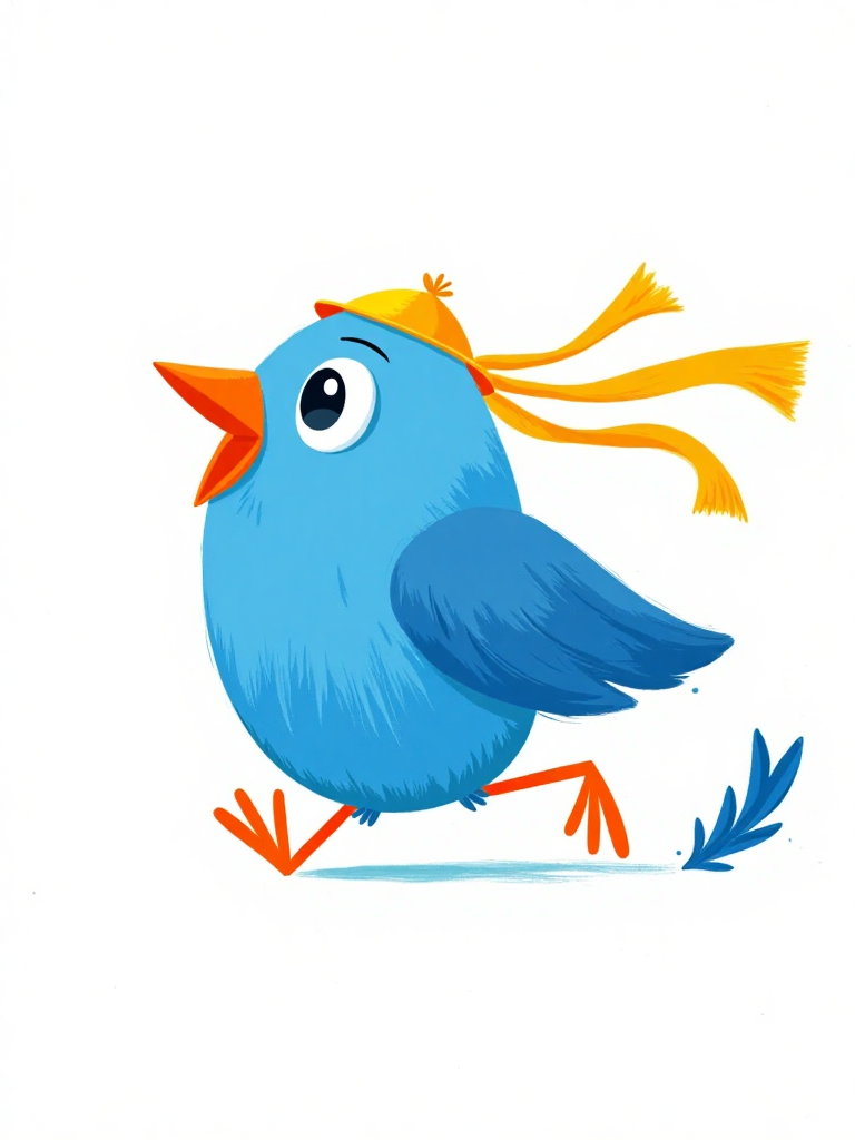 Cartoon - style illustration, a chubby bird wearing a striped scarf, standing on a snowy branch, simple background, soft colors.