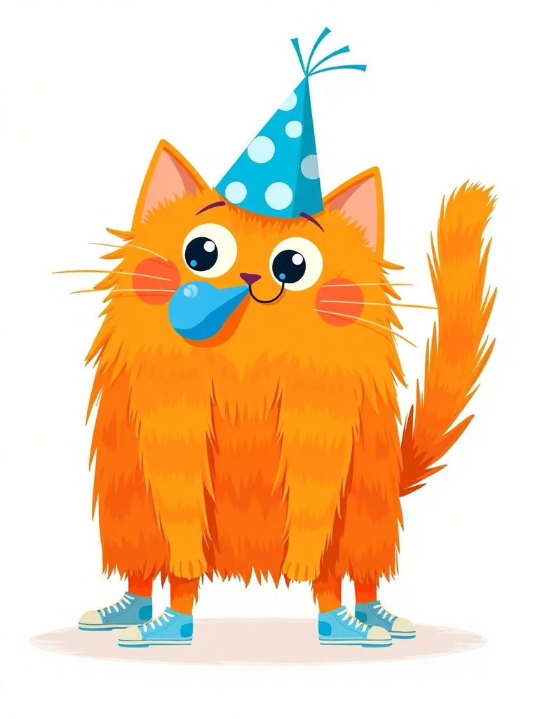 Cartoon - style illustration, a fluffy orange cat and a blue bird, interacting playfully, light - hearted scene.