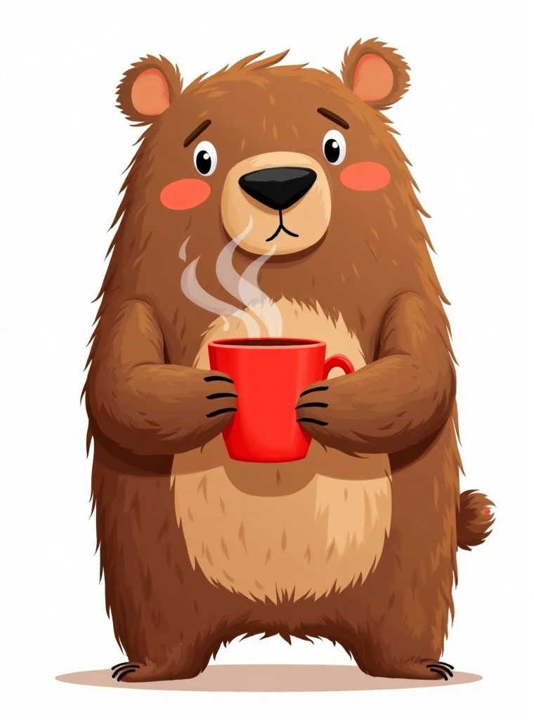 Cartoon - style illustration, a brown bear holding a red mug, steam rising, in a wooden cabin atmosphere.