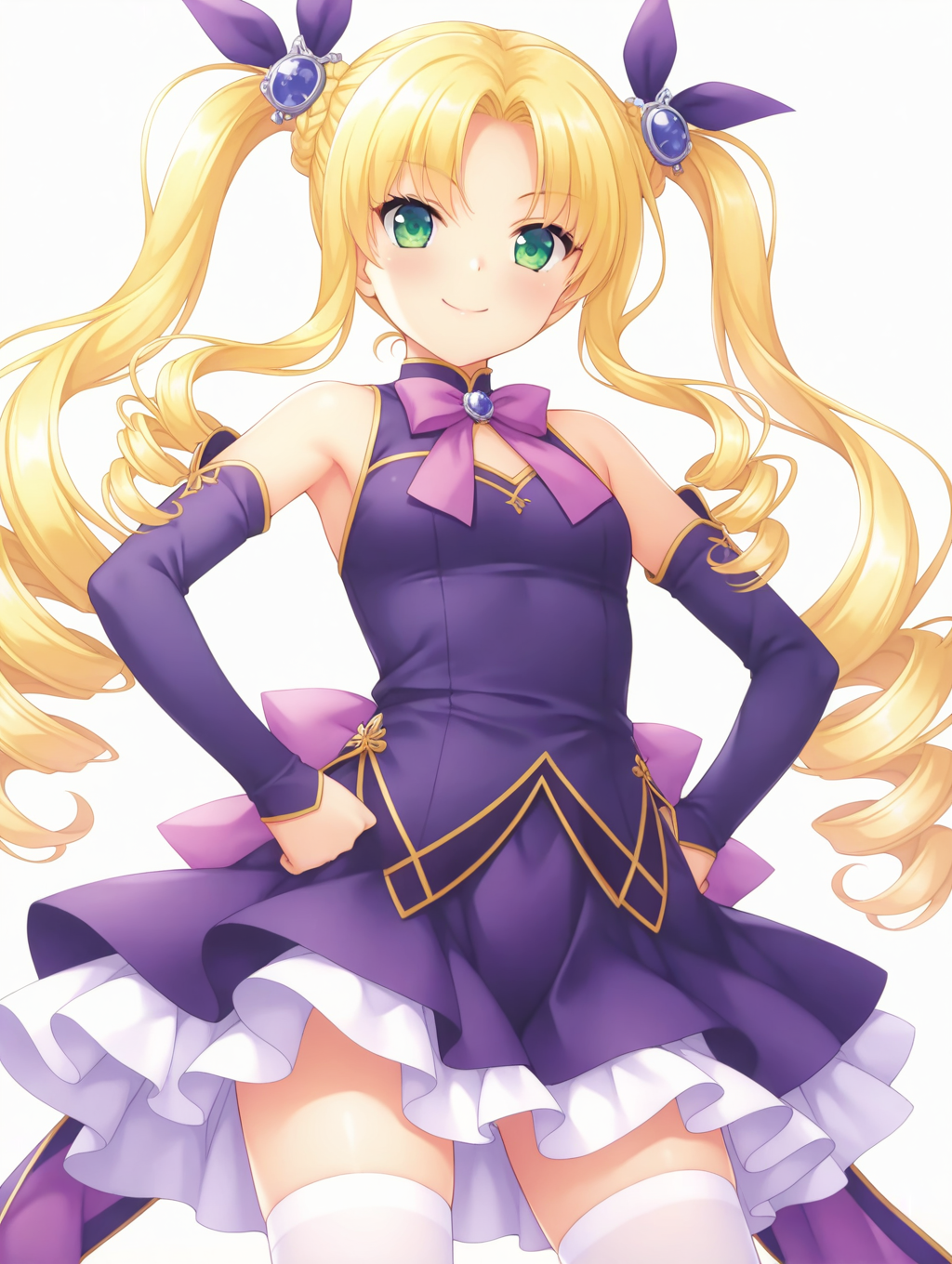 enjutsu kouro, 1girl, blonde hair, solo, twintails, detached sleeves, drill hair, hands on own hips, green eyes, long hair, white thighhighs, purple skirt, hair ornament, smile, looking at viewer, elbow glove, purple glove, bowtie, purple shirt, pleated skirt