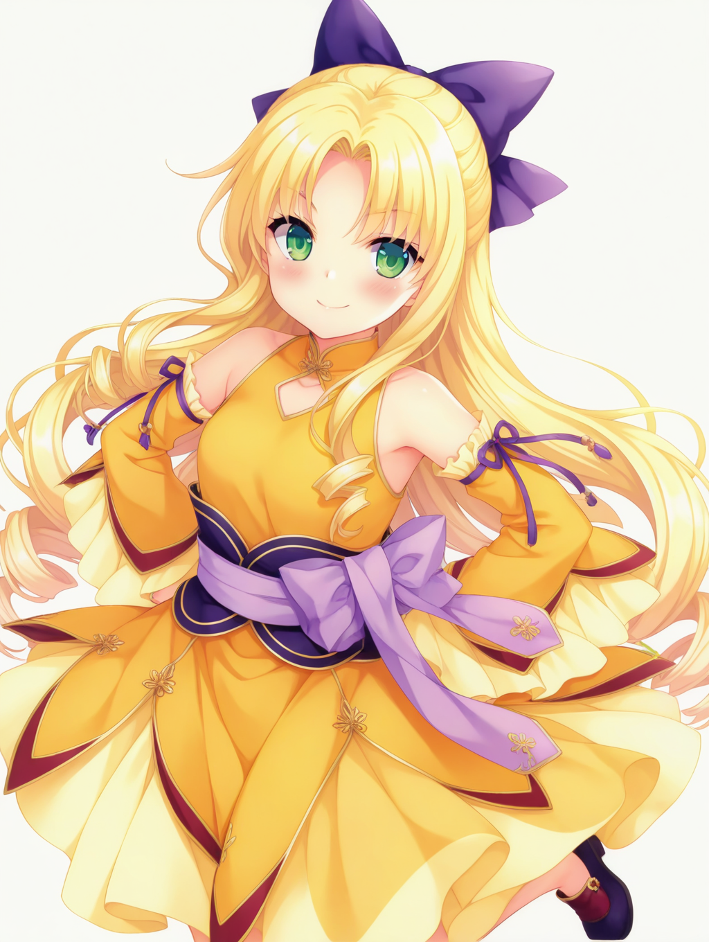 enjutsu kouro,1girl,long hair,solo,blonde hair,detached sleeves,green eyes,yellow dress,curly hair,smile,hands on own hips,very long hair,blush,shoes,hair bow,purple bow,obi,looking at viewer,