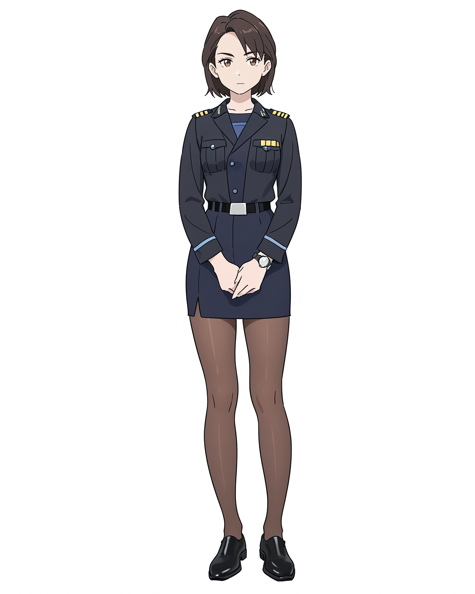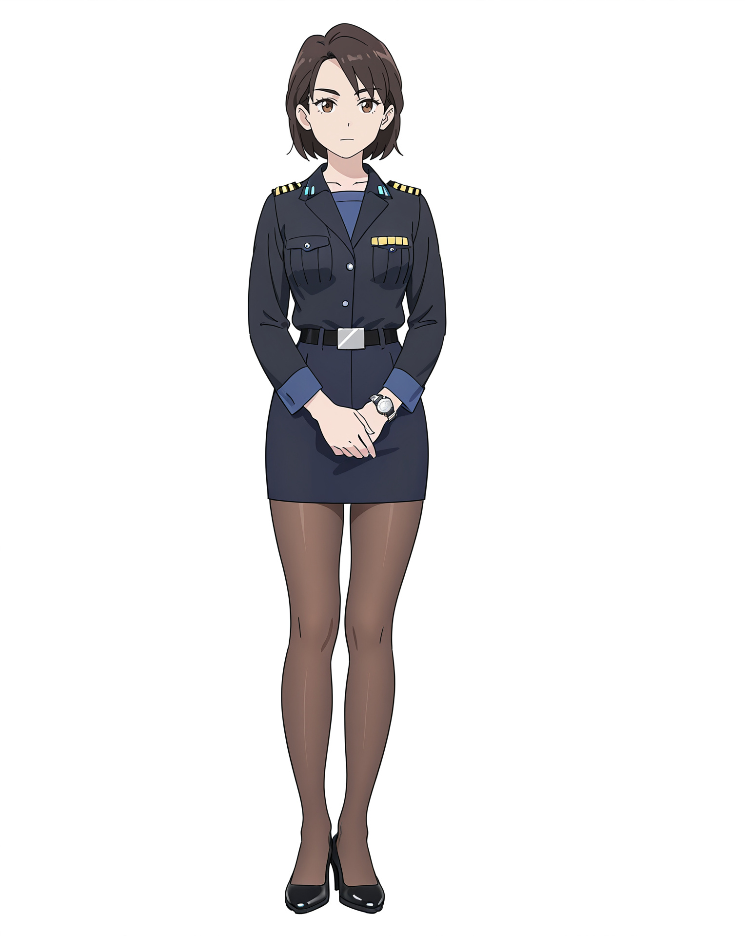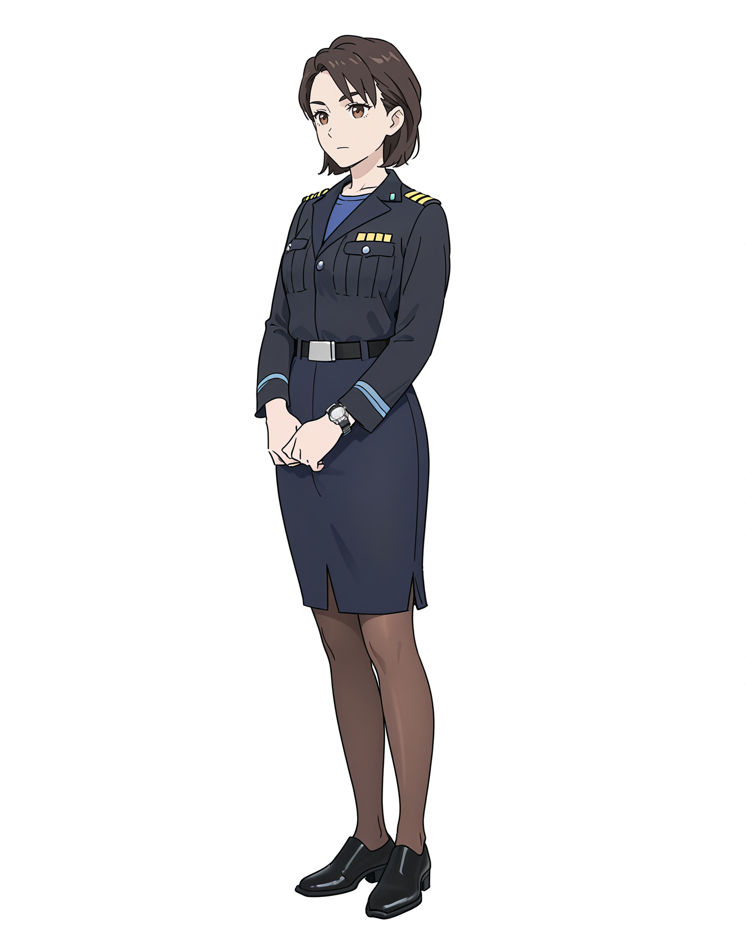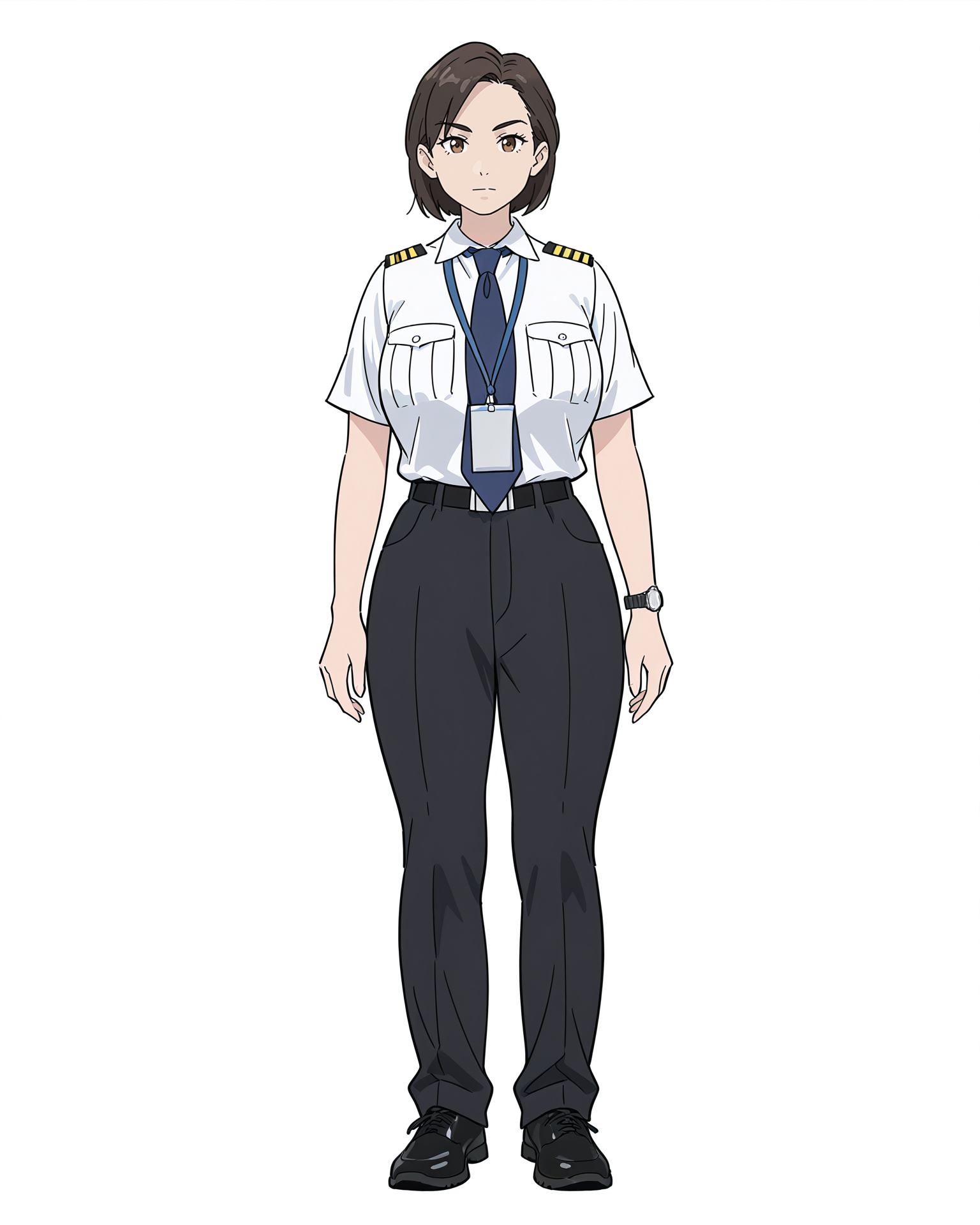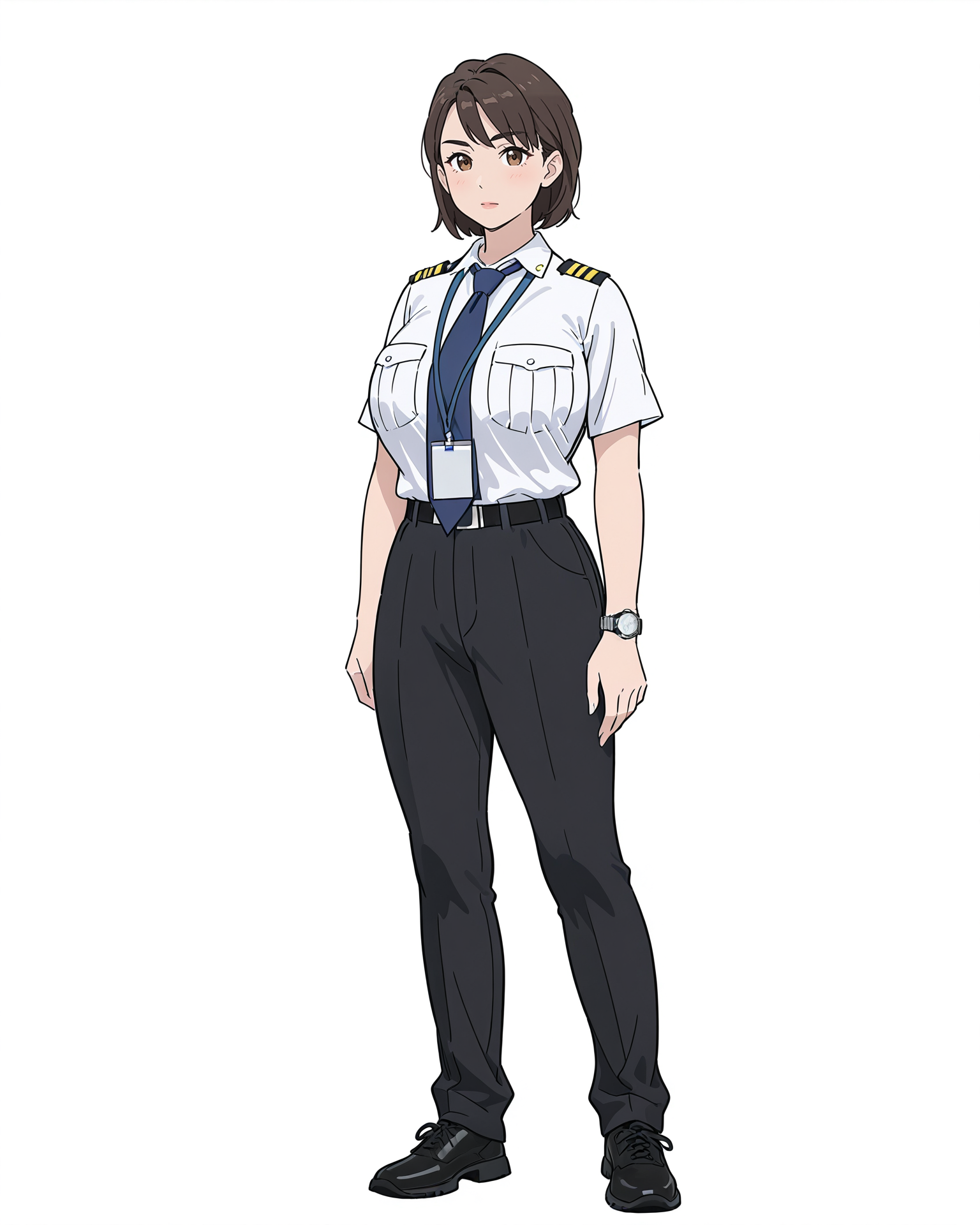 female captain,white t-shirt and black panty,solo,watch,wristwatch,pants,shirt,white background,black footwear,full body,simple background,black pants,1girl,breast pocket,white shirt,uniform,brown eyes,necktie,pocket,brown hair,short sleeves,shirt tucked in,standing,belt,blue necktie,looking at viewer,short hair,shoes,closed mouth,arms at sides,huge breasts,curvy,