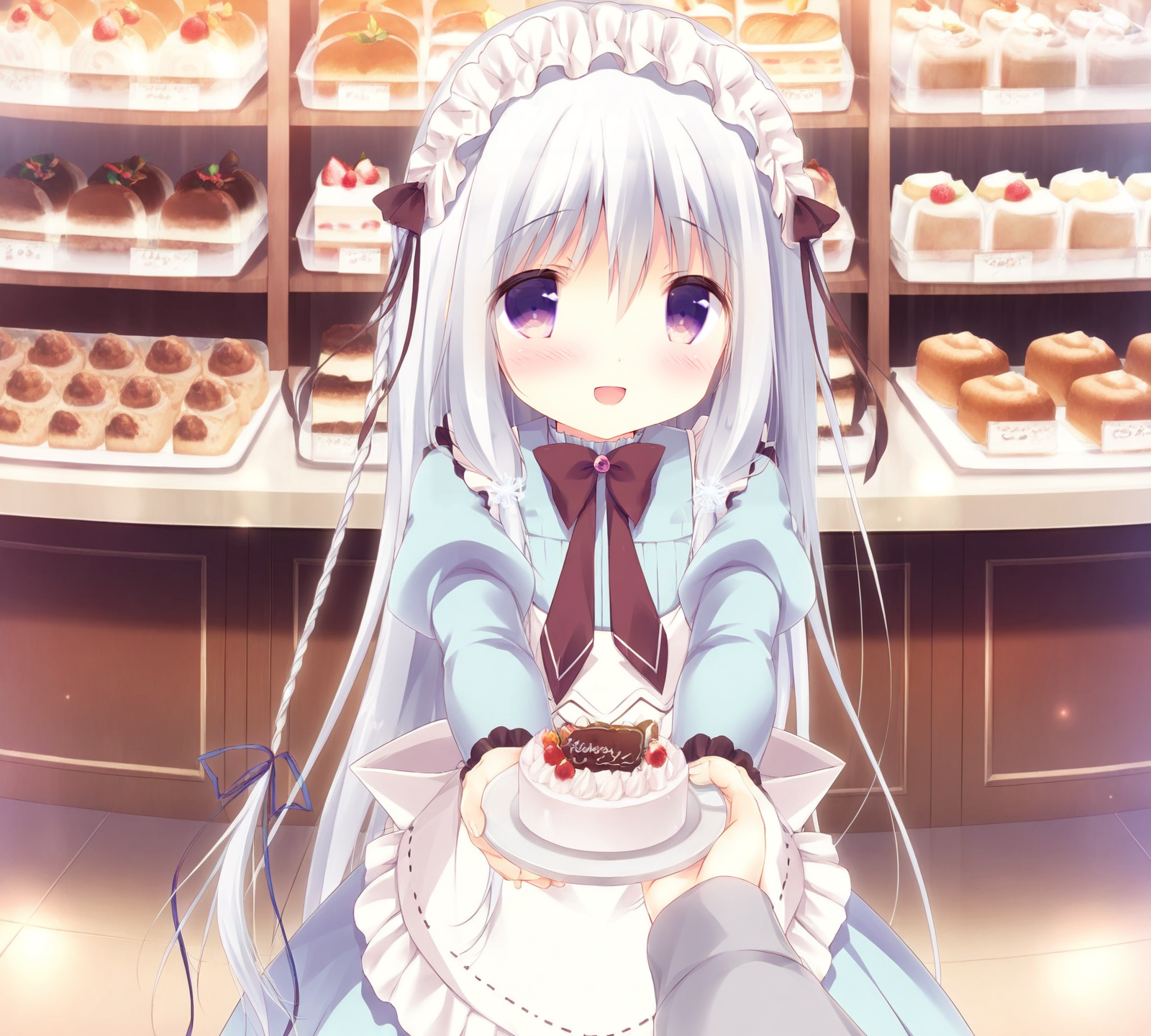 女仆装:maid headdress,apron,white pantyhose,maid,blue dress,long sleeves,ribbon,brown footwear,brown bow