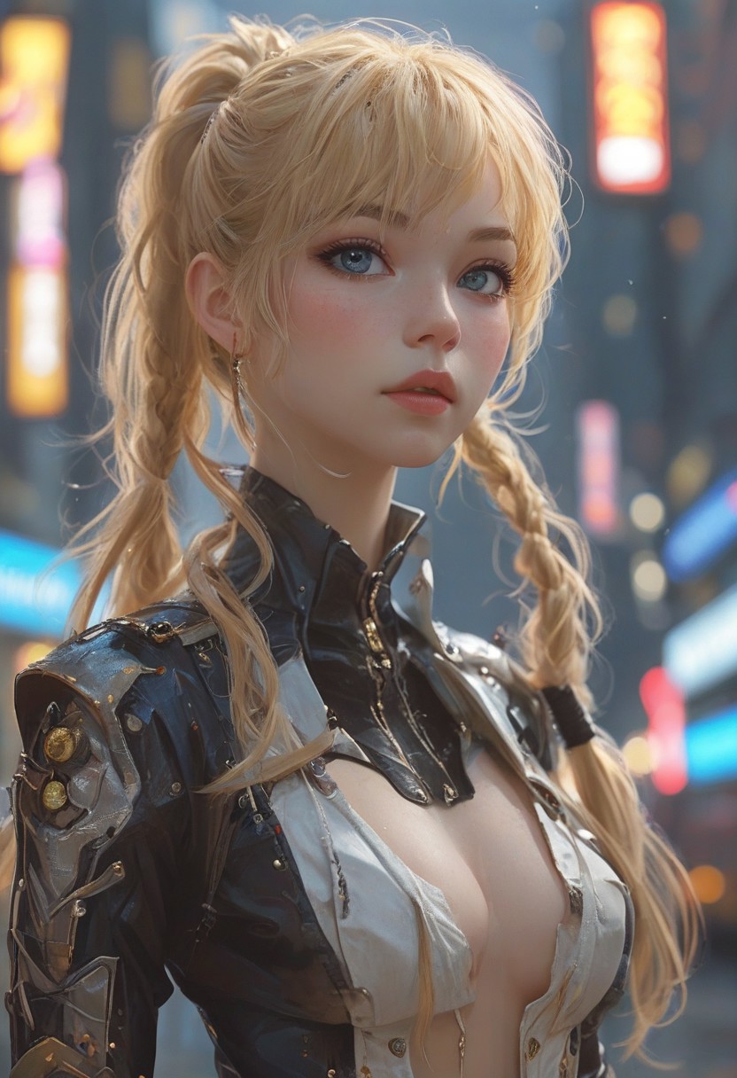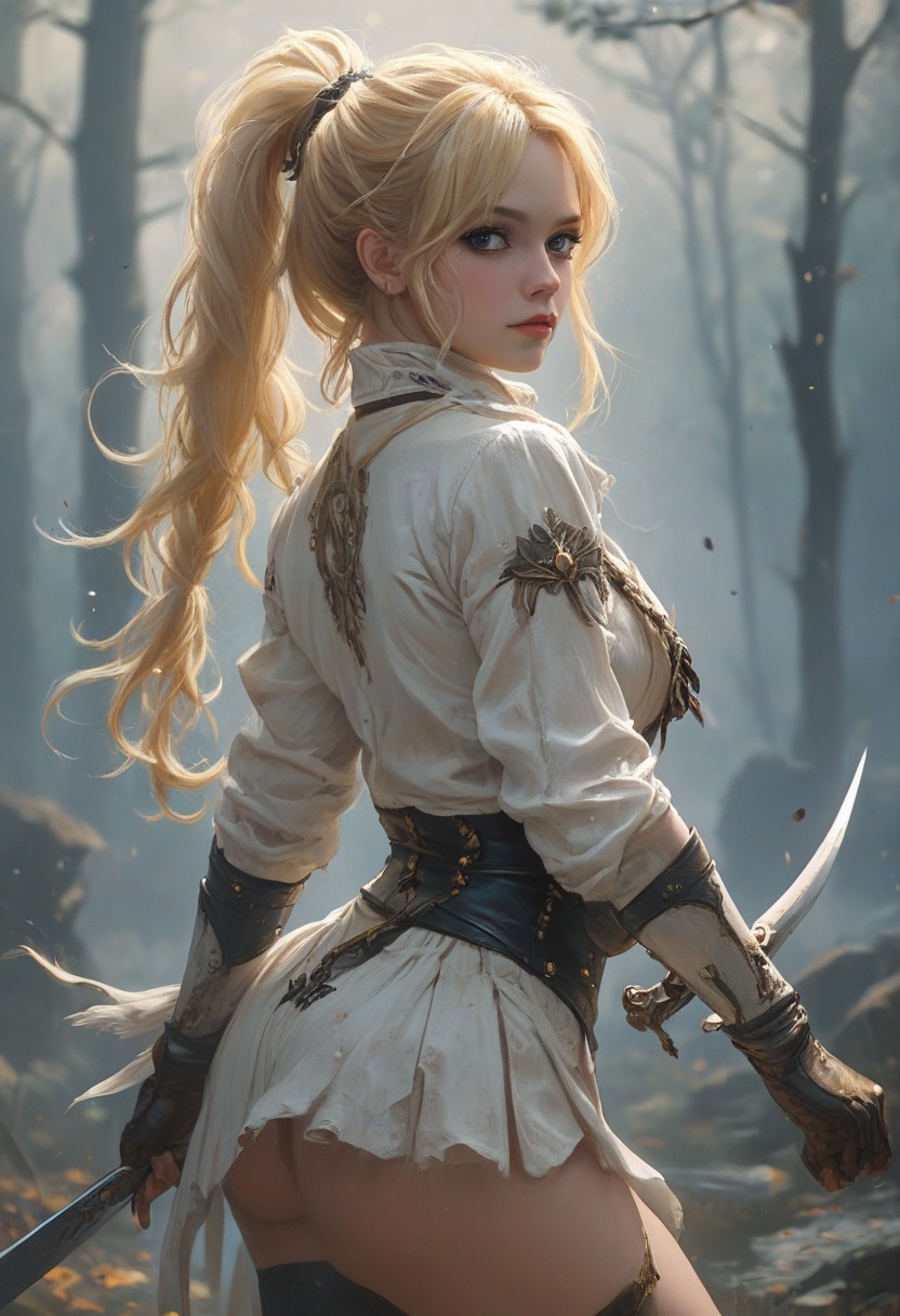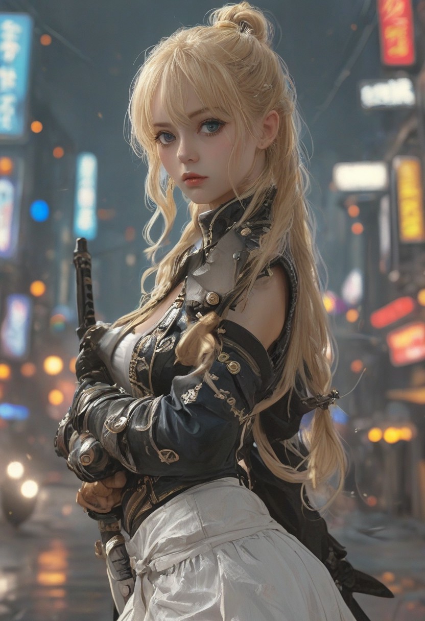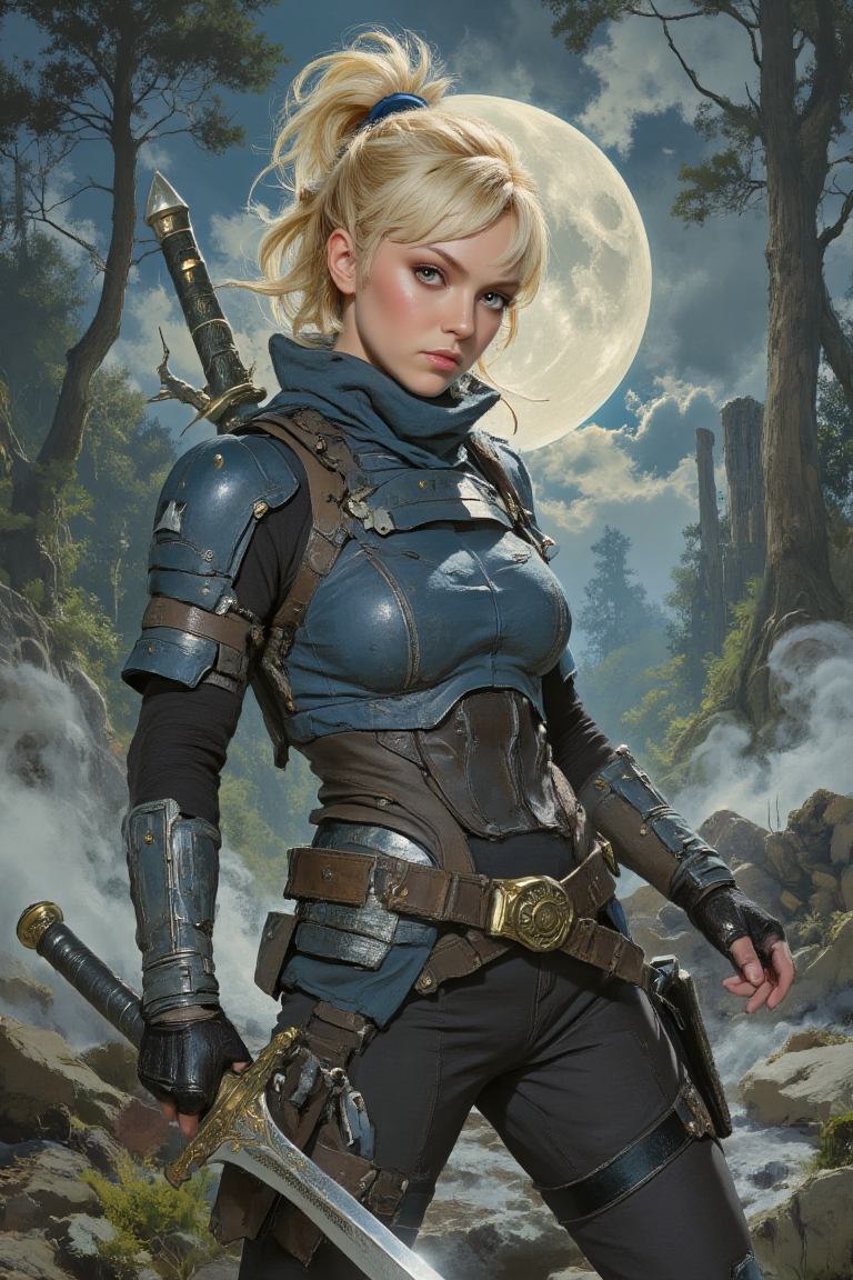 Sample Prompt: A beautiful anime-style female assassin with long golden-blonde hair tied in a high ponytail, wearing a sleek, dark blue and black combat outfit with silver accents. She has piercing blue eyes and a calm, focused expression. Her outfit is form-fitting and designed for agility, with thigh-high boots, gloves, and a utility belt. She holds a slender, ornate dagger in one hand, poised in a graceful battle stance. The background is a moonlit forest with mist swirling around her feet, casting dramatic shadows. Her hair and clothes flutter slightly in the night breeze, emphasizing her elegance and lethality. The art style is detailed and vibrant, similar to high-quality anime character illustrations