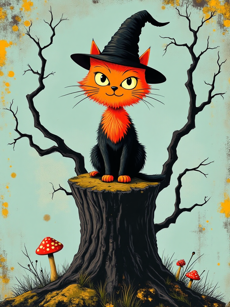 Dr. Seuss illustration style, a magical cat with a hat that changes patterns, sitting on a rooftop made of wavy tiles under a moon with a face.