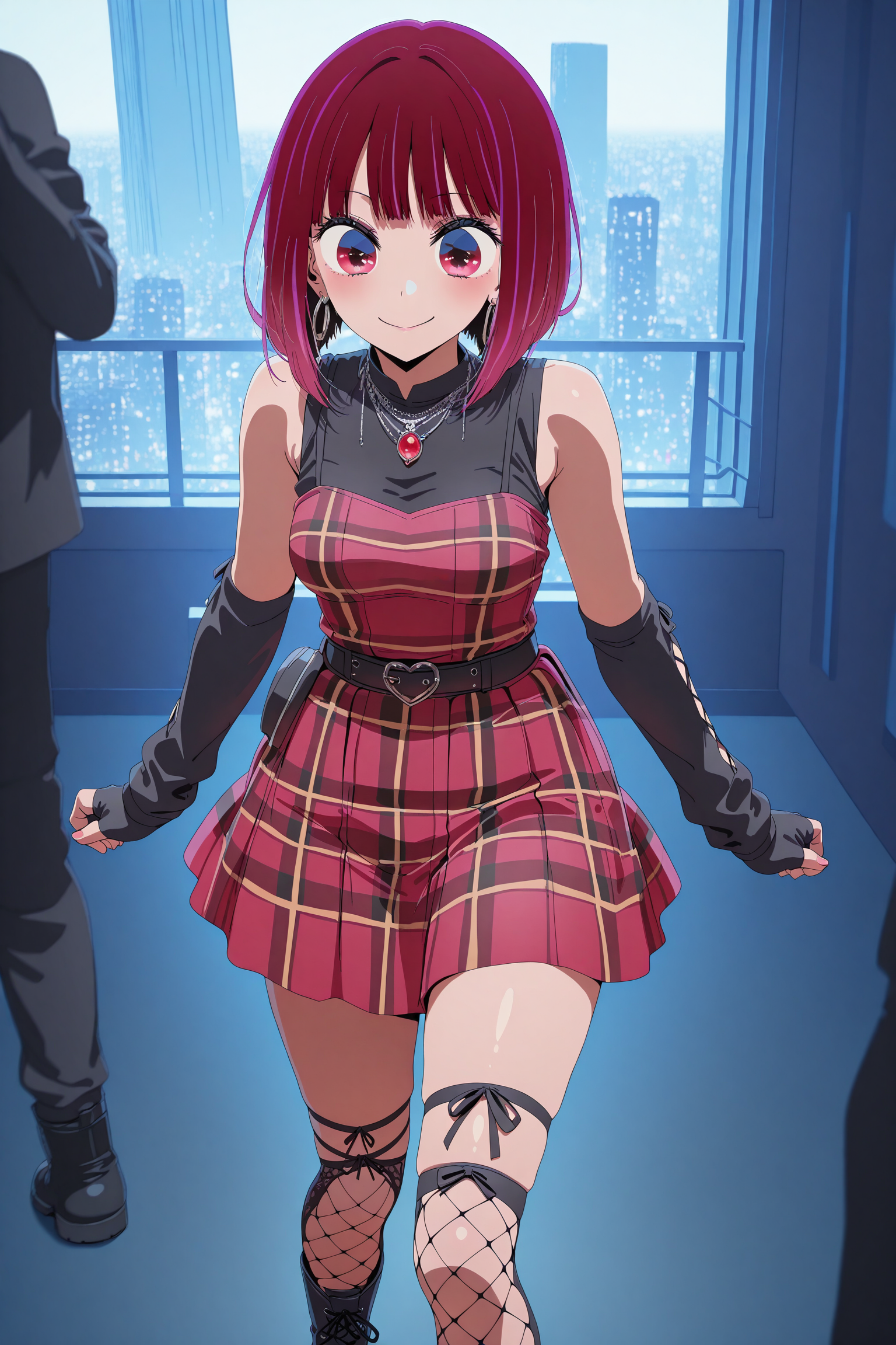 Red_gothic_dress, sleeveless dress, red plaid, plaid pattern, pleated skirt, plaid skirt, black belt, heart-shaped buckle, hoop earrings, metal necklace, ornate necklace, red gemstone, cross pendant, gothic necklace, fishnet arm warmers, fingerless gloves,thighhighs, lace-up legwear, combat boots, black footwear,