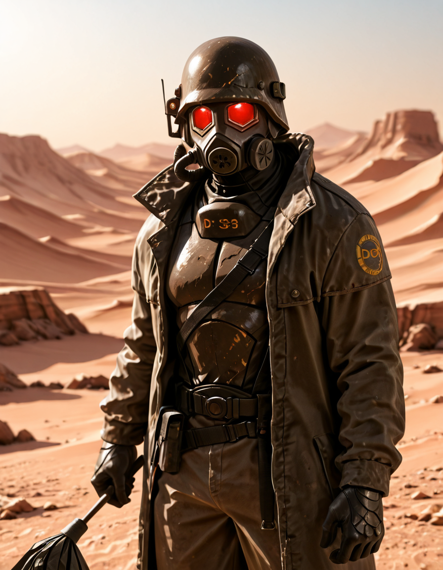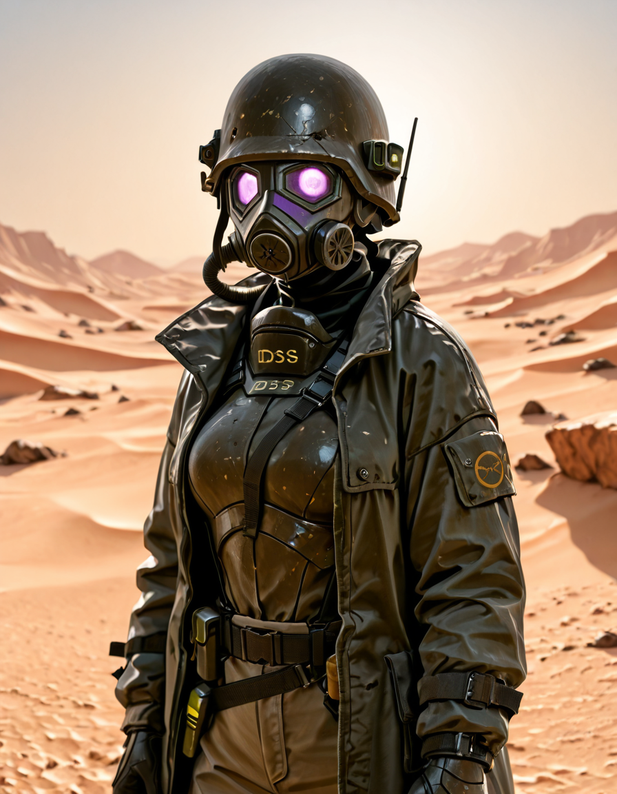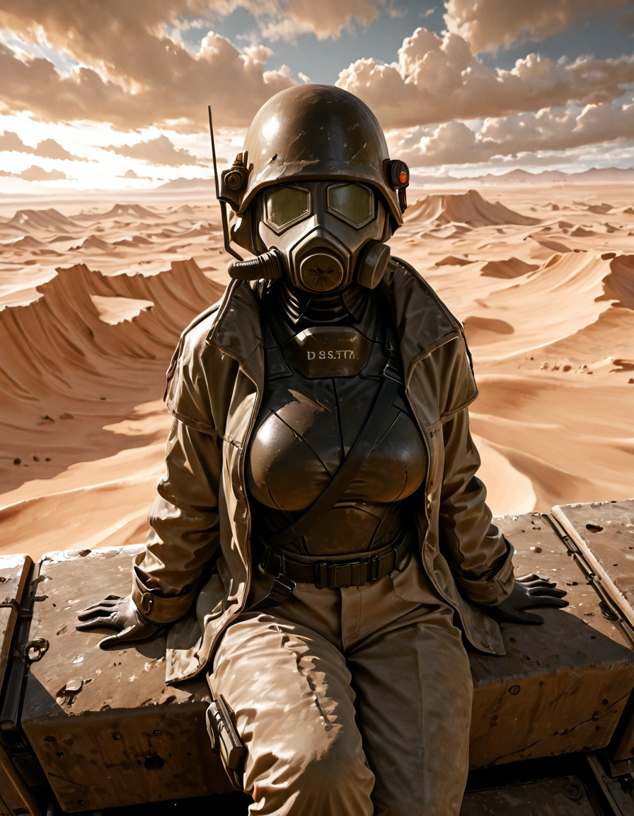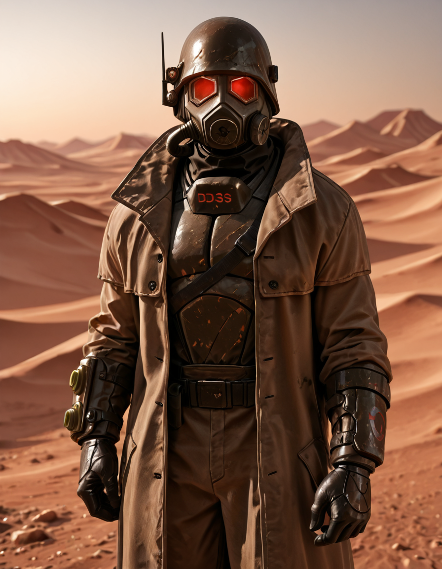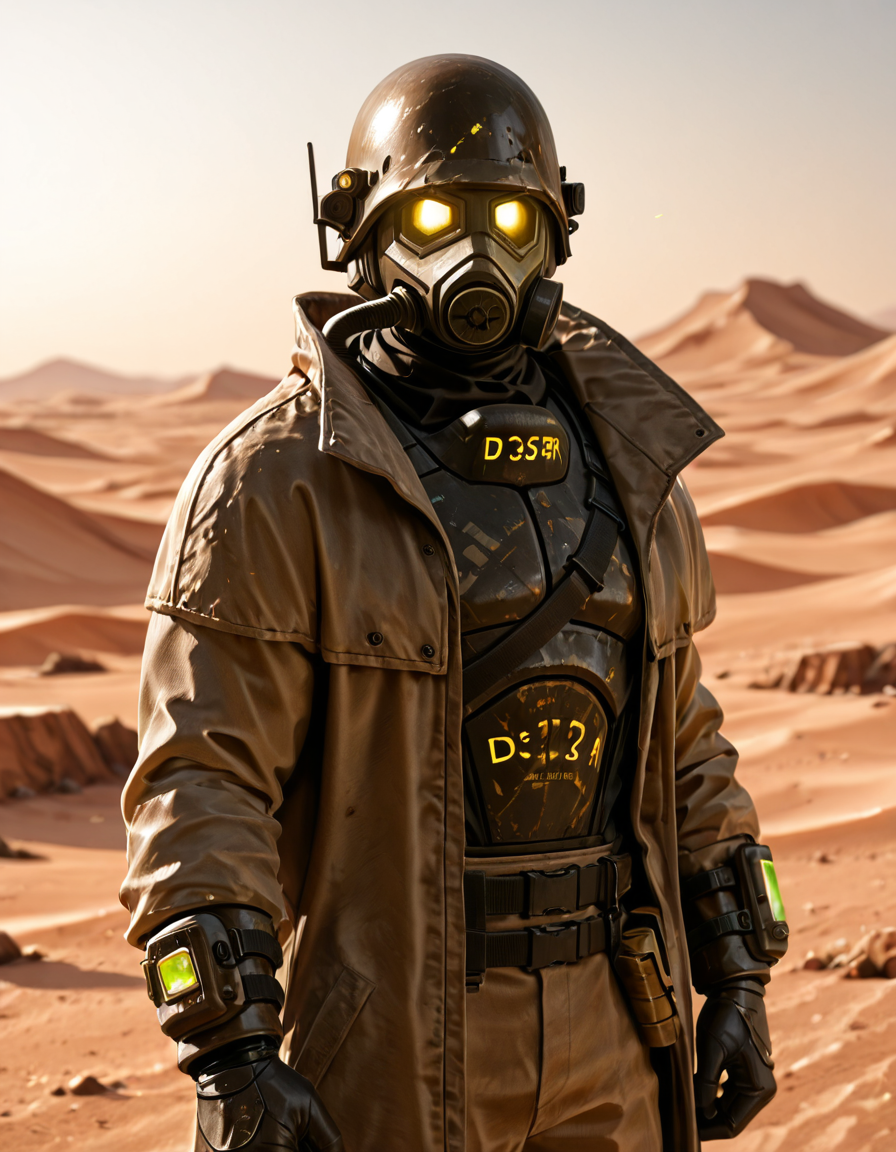 1boy, d3s3rtr4ng3r, helmet, gas mask, brown coat