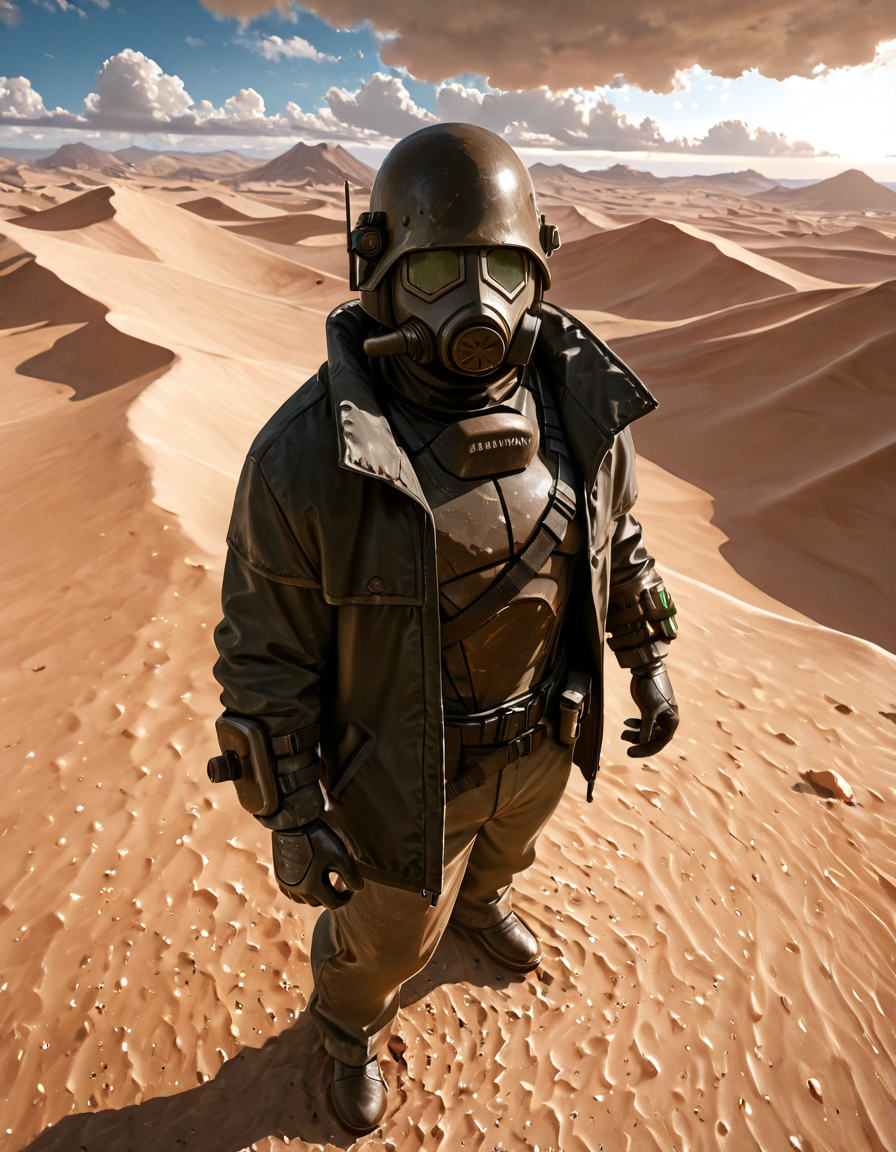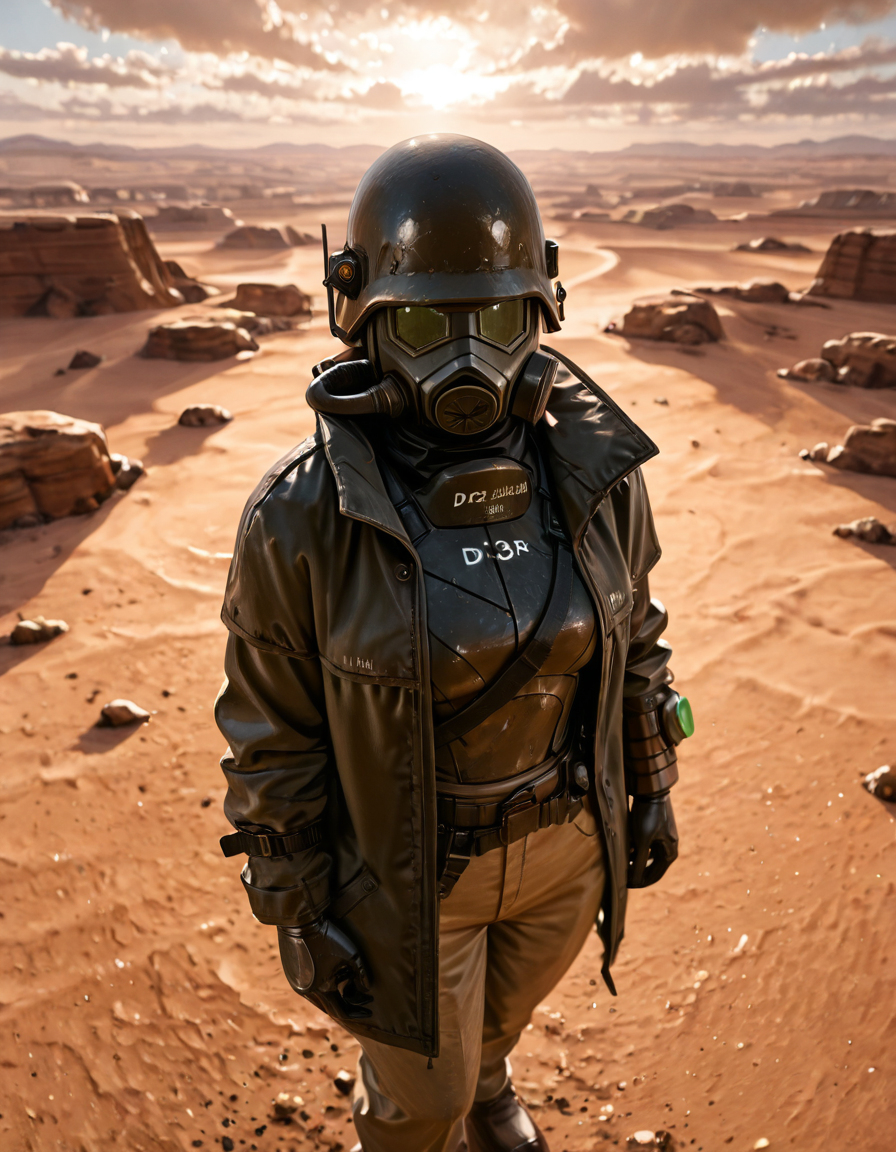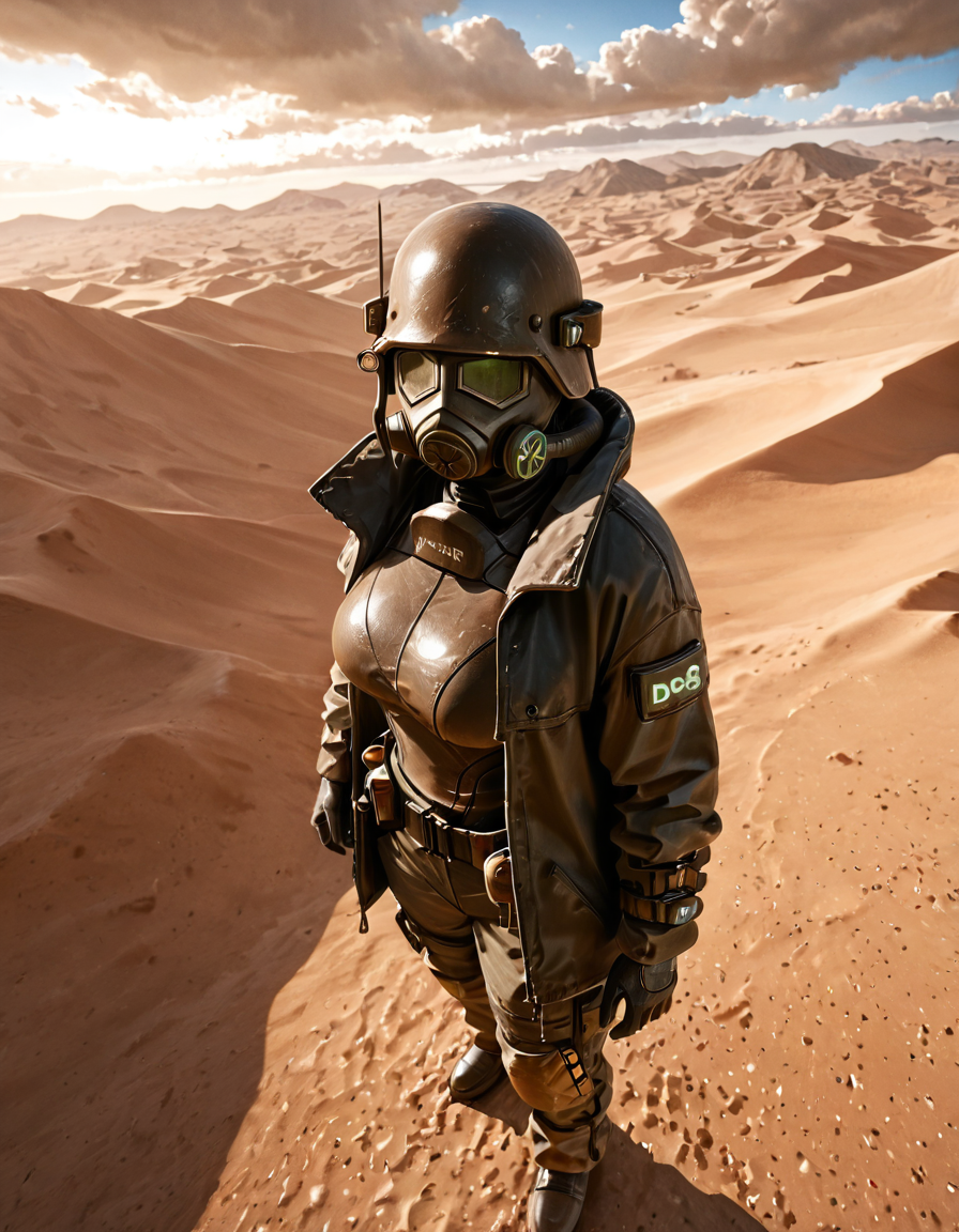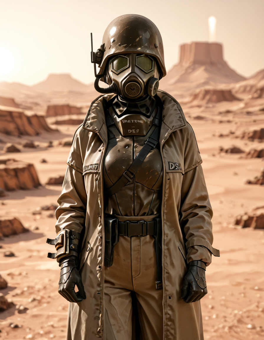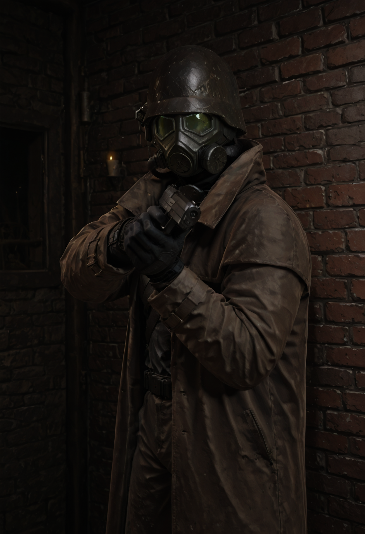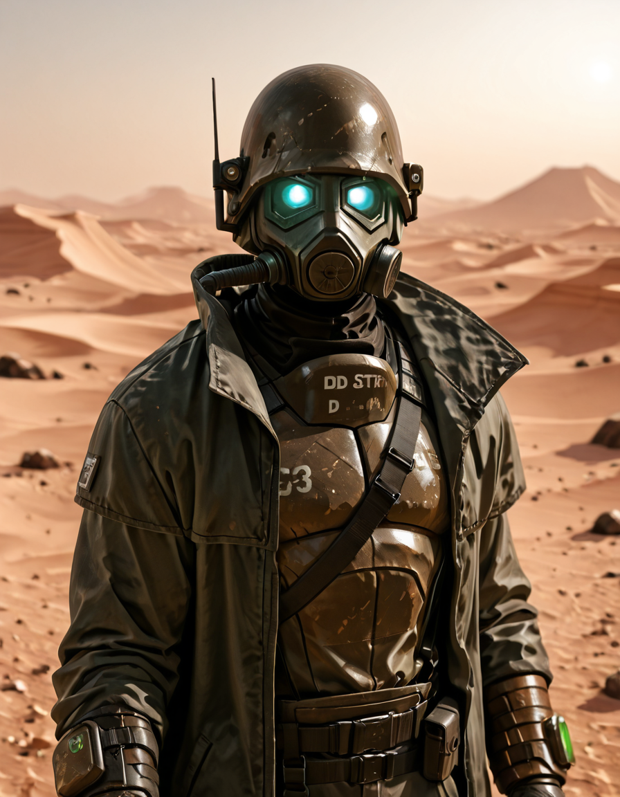 1boy, d3s3rtr4ng3r, helmet, gas mask, brown coat