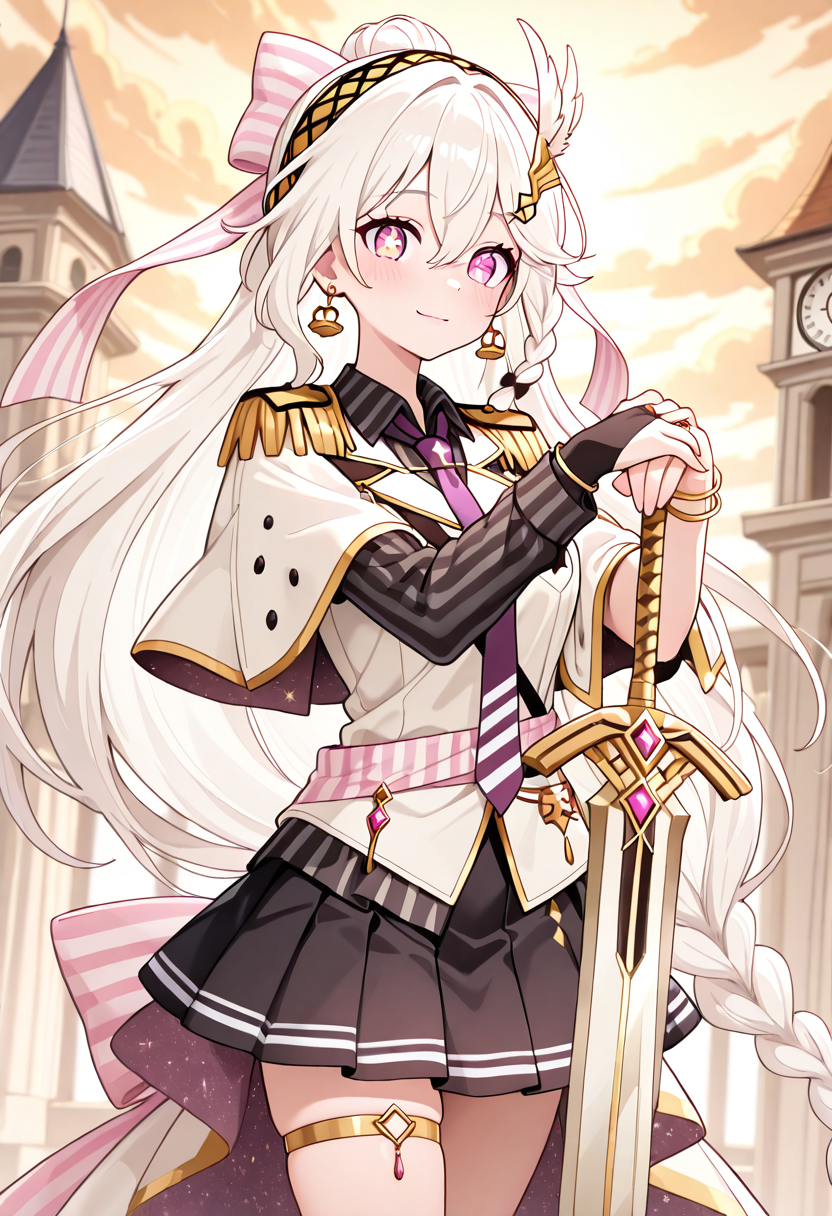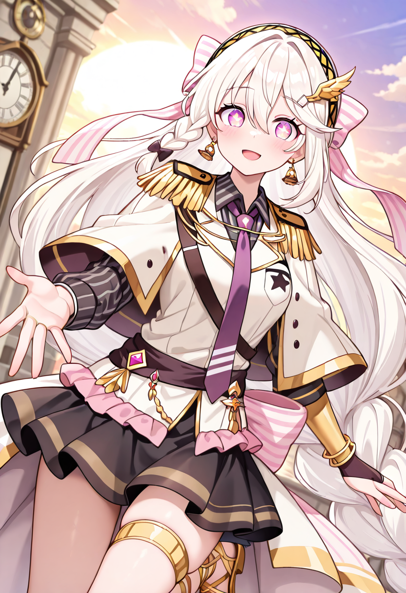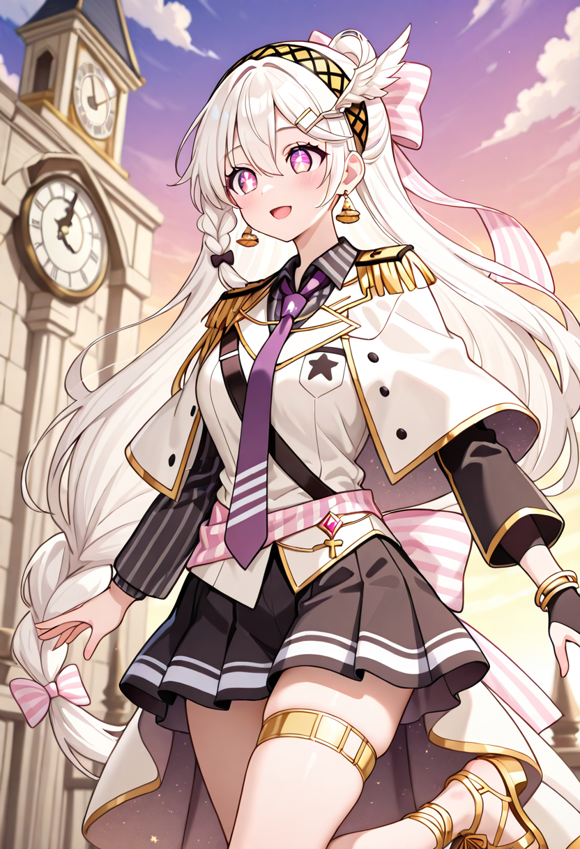 astraea_original,1girl,solo,white hair,very long hair,single braid,low-tied long hair,hair between eyes,star-shaped pupils,pupils,pink eyes,hairband,striped bow,hair bow,feather hair ornament,uniform,white dress,long sleeves capelet,epaulettes,gold trim,purple necktie,single glove,bridal gauntlets,black skirt,striped shirt,thigh strap,sandals,gold footwear,cross-laced footwear,jewelry,earrings,