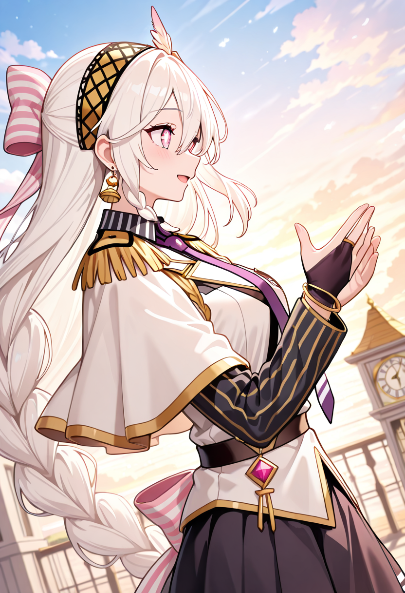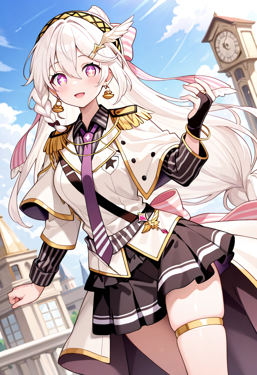 star-shaped pupils,pupils,pink eyes,hairband,striped bow,hair bow,feather hair ornament,uniform,white dress,long sleeves capelet,epaulettes,gold trim,purple necktie,single glove,bridal gauntlets,black skirt,striped shirt,thigh strap,sandals,gold footwear,cross-laced footwear,jewelry,earrings,