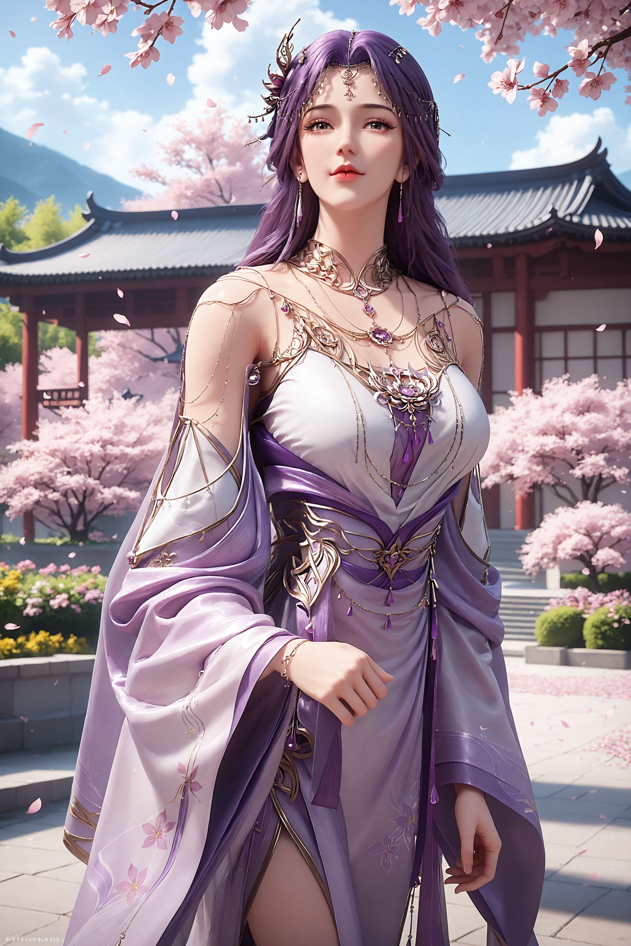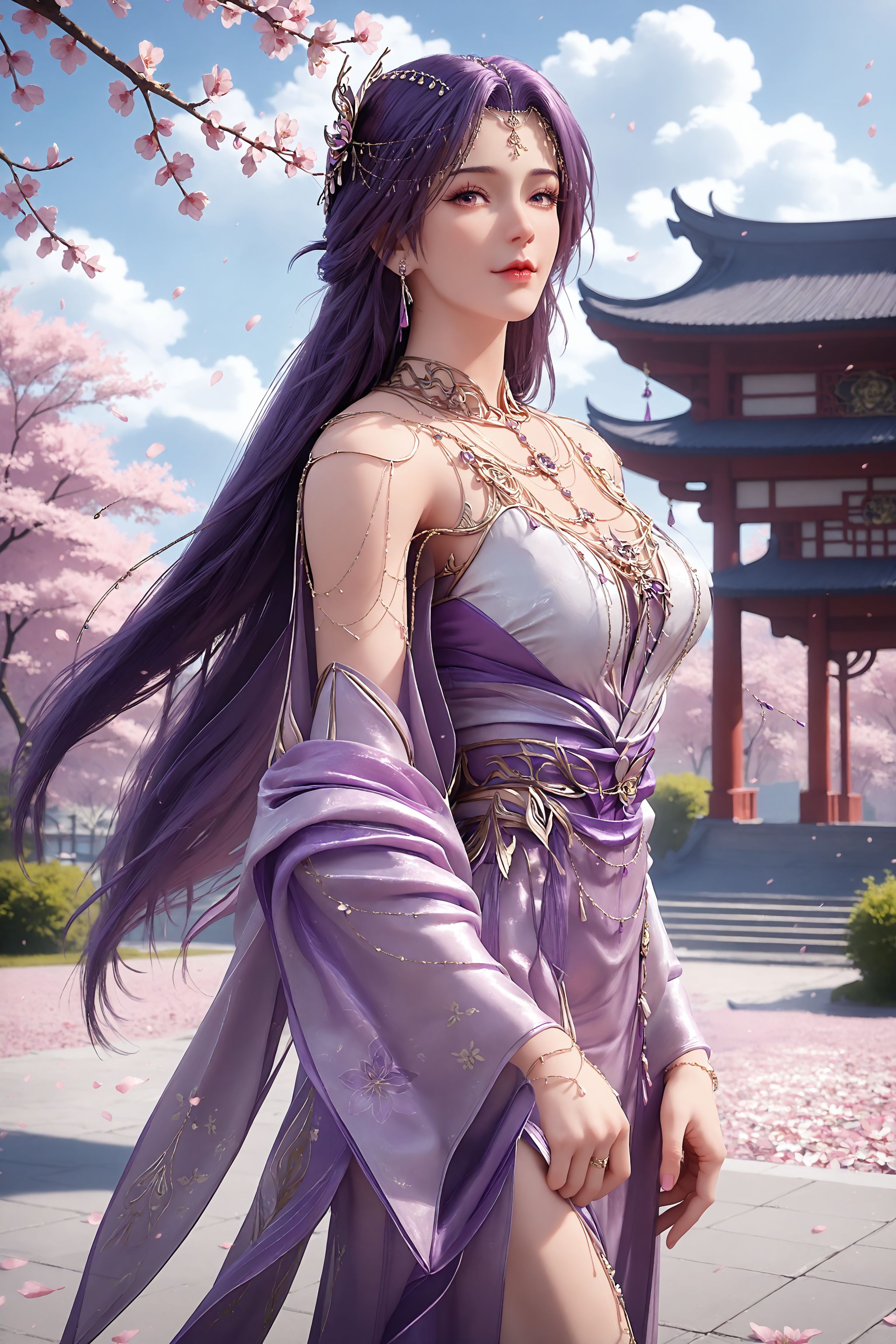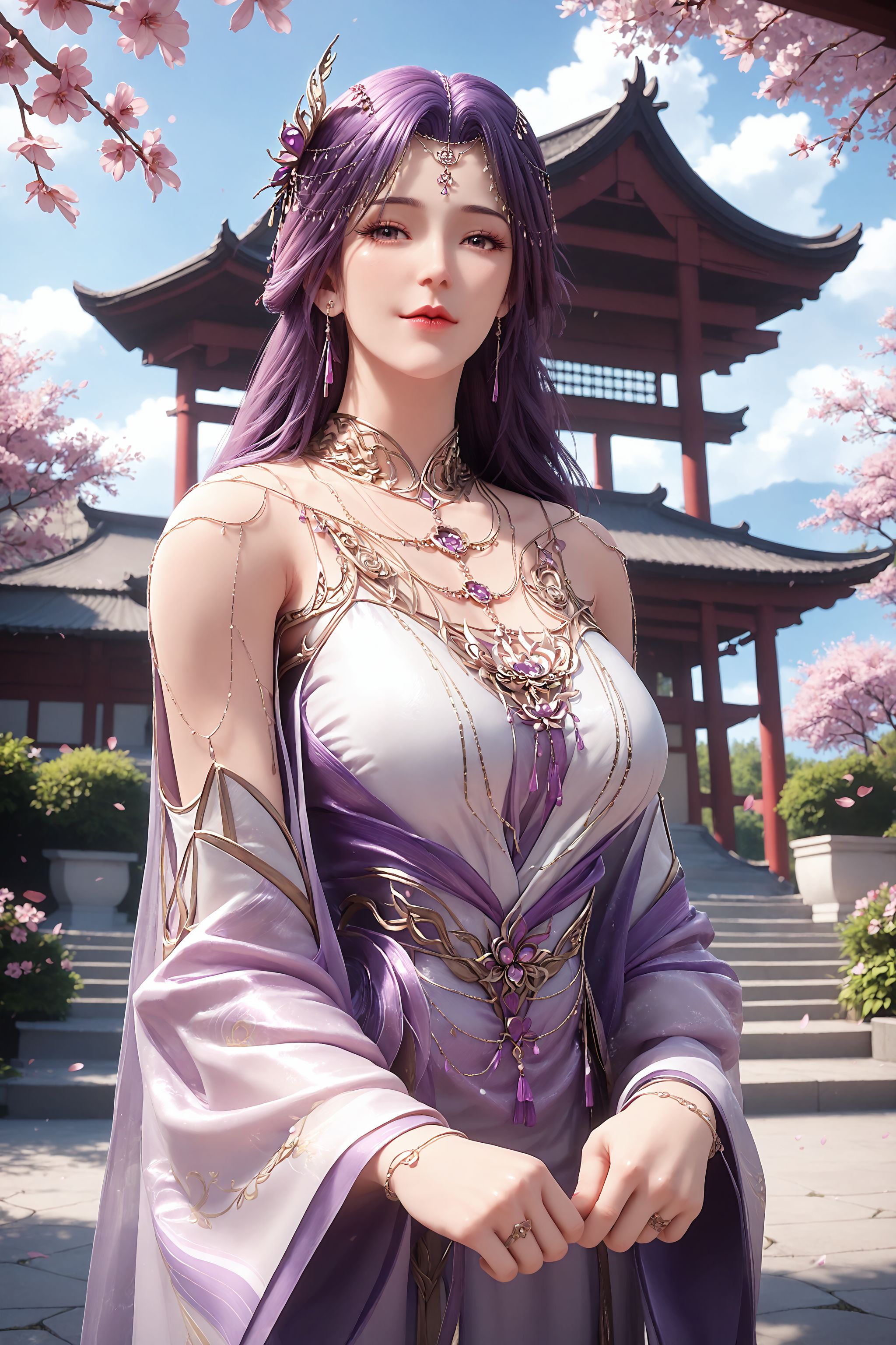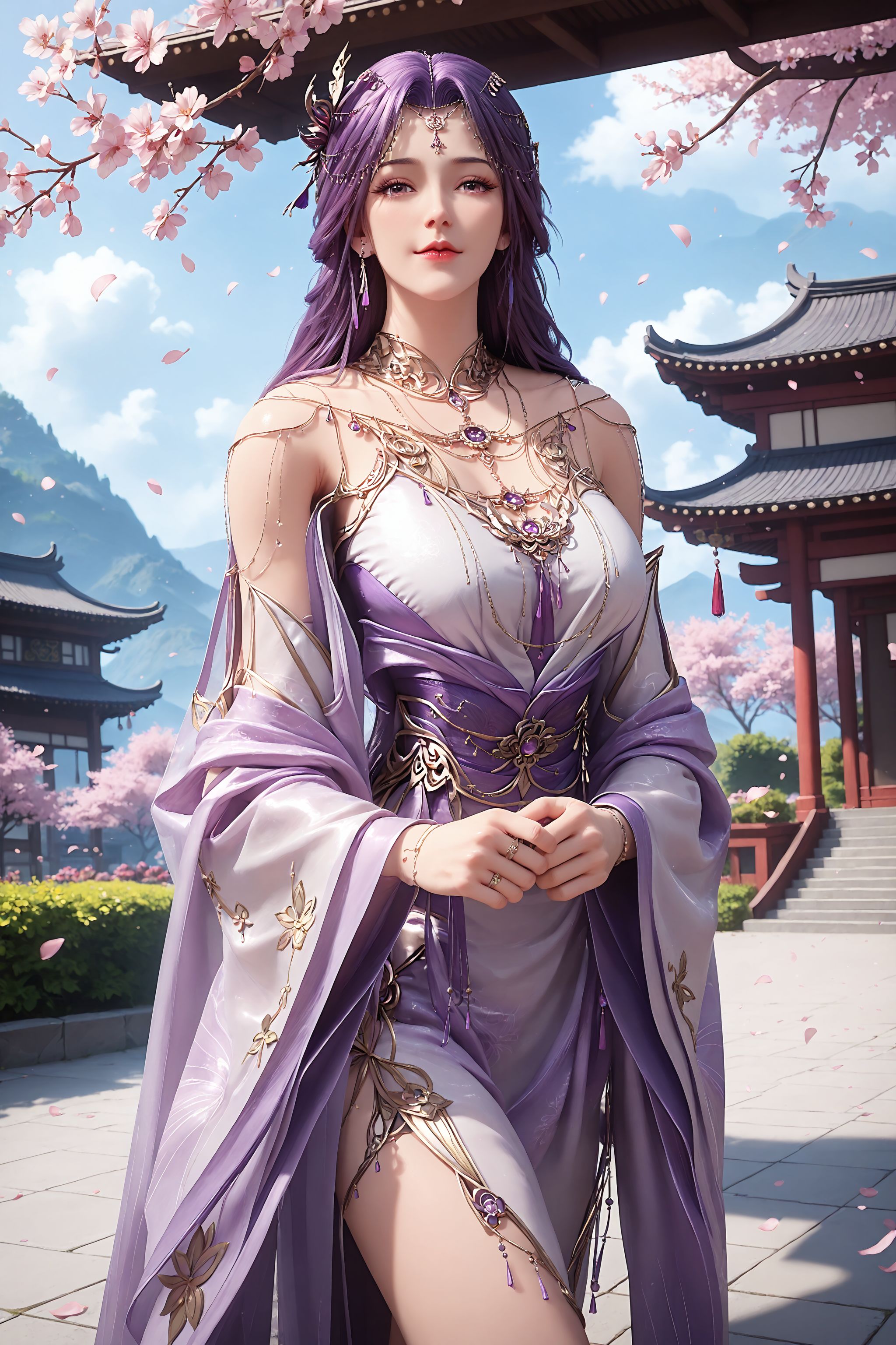1girl, long hair, solo, purple hair, jewelry, dress, hair ornament, necklace, bare shoulders, detached sleeves, wide sleeves