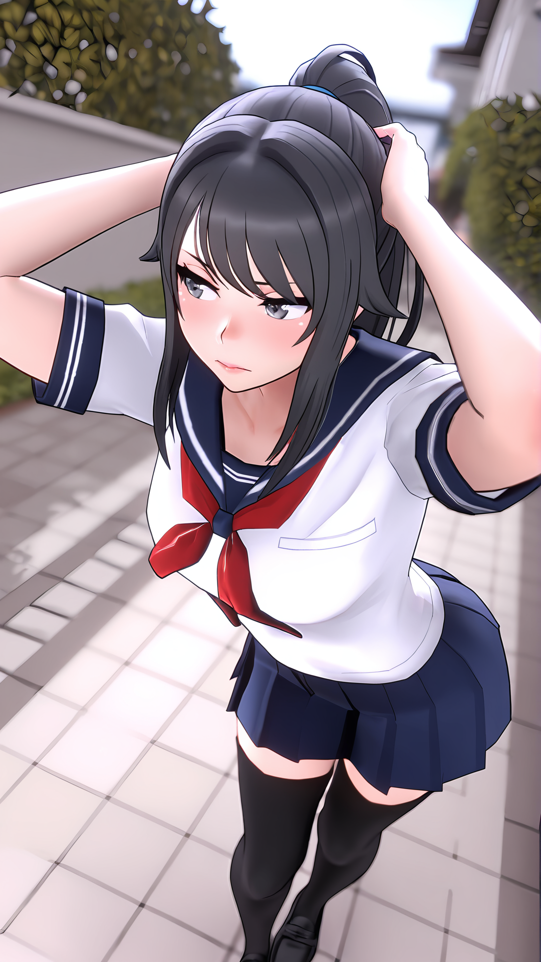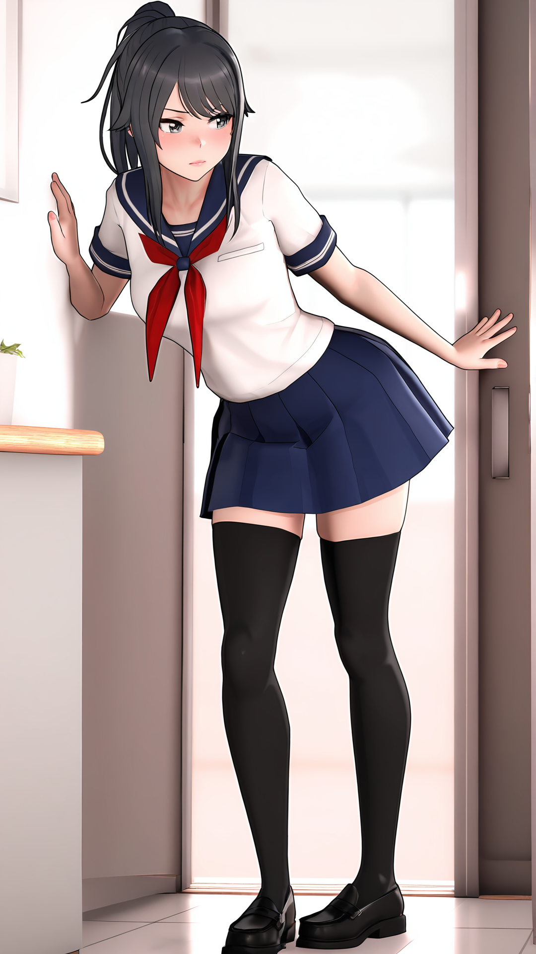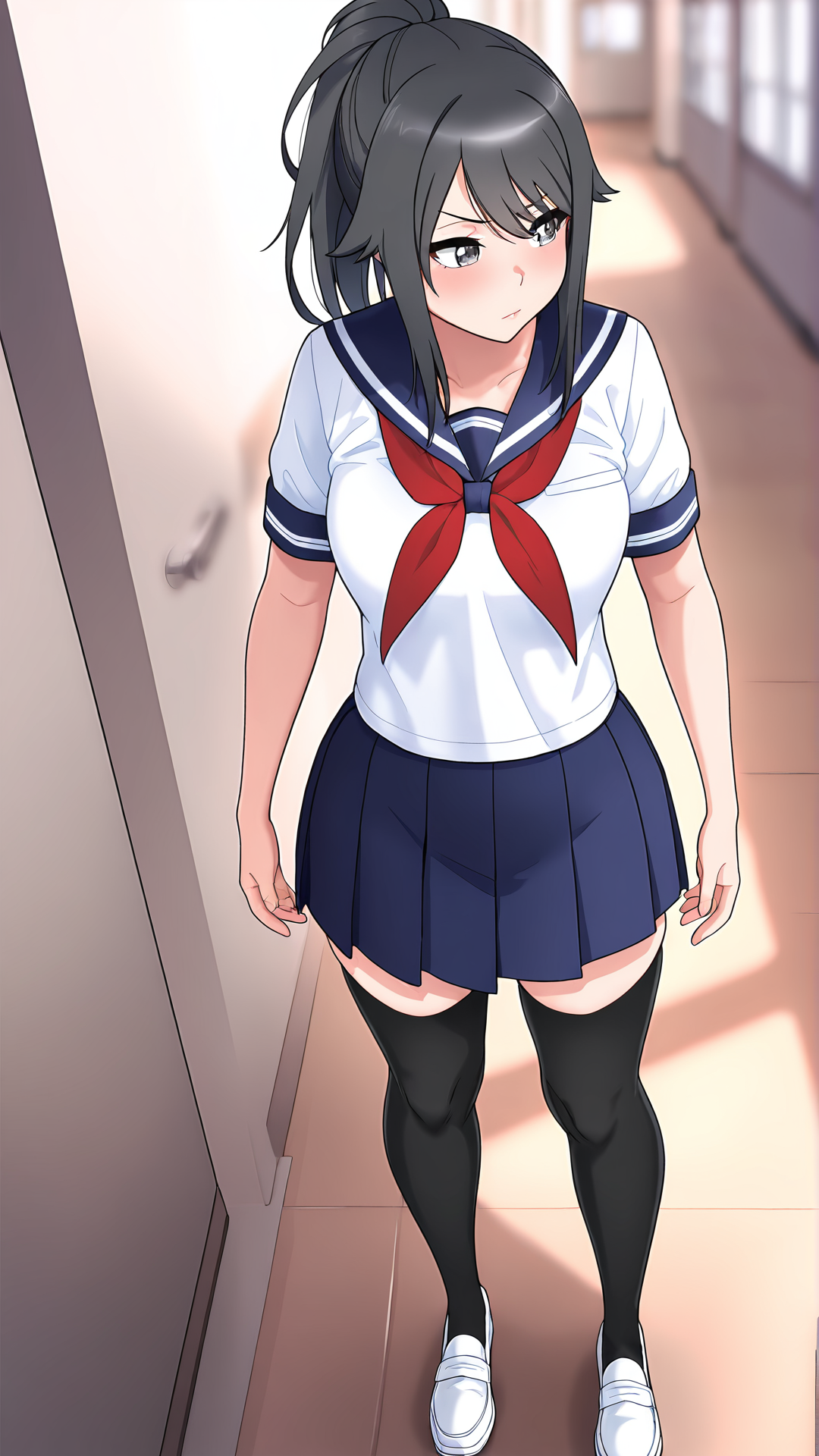 Ayano Aishi,1girl,solo,school uniform,black hair,skirt,ponytail,serafuku,zettai ryouiki,black thighhighs,pleated skirt,shoes,