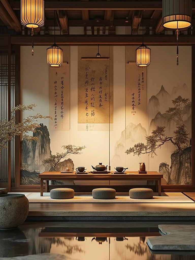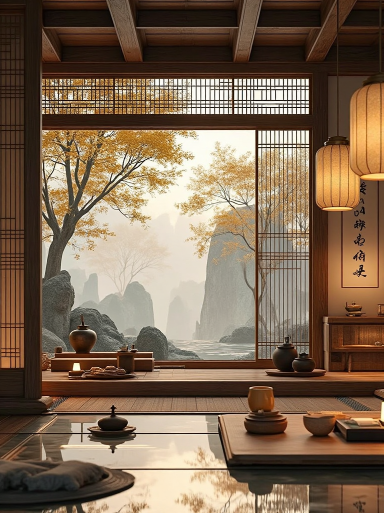 4. Traditional Japanese interior style, shoji - lit corners, low wooden tables, soft - glowing pendant lanterns, a water basin with floating lanterns, minimalist decor.