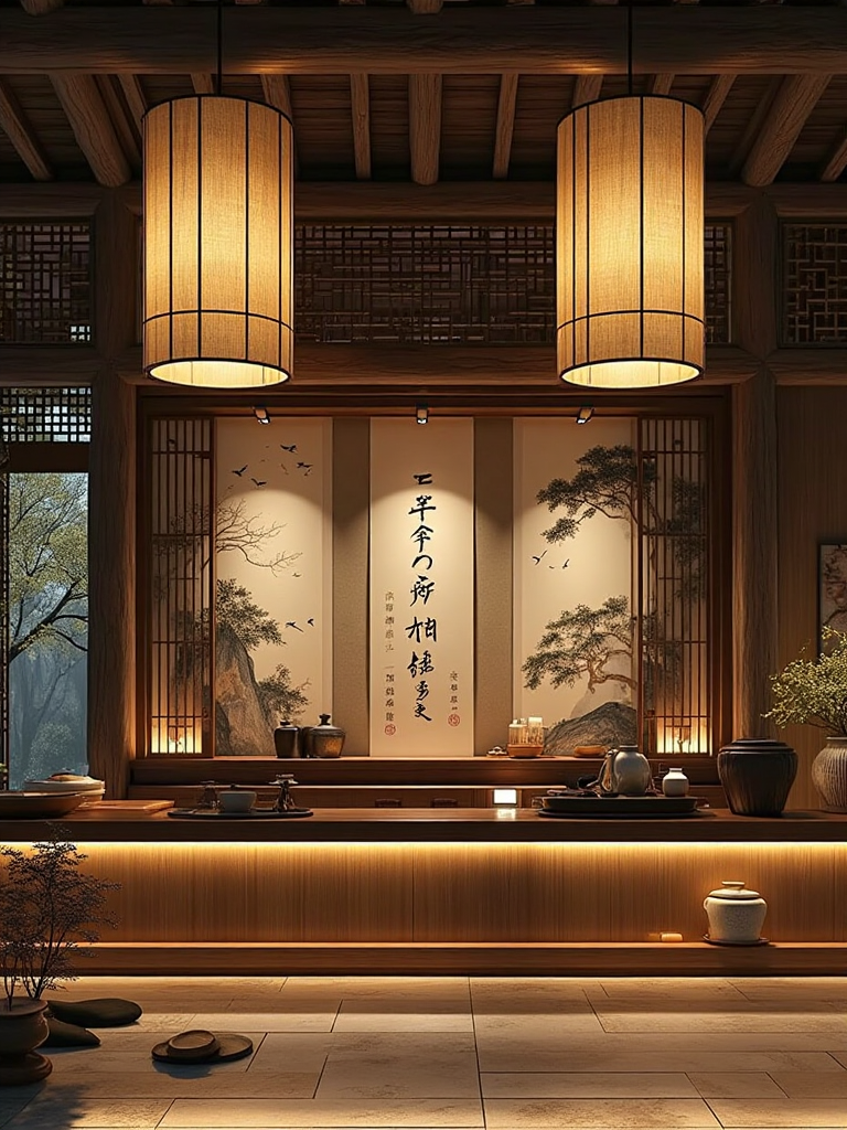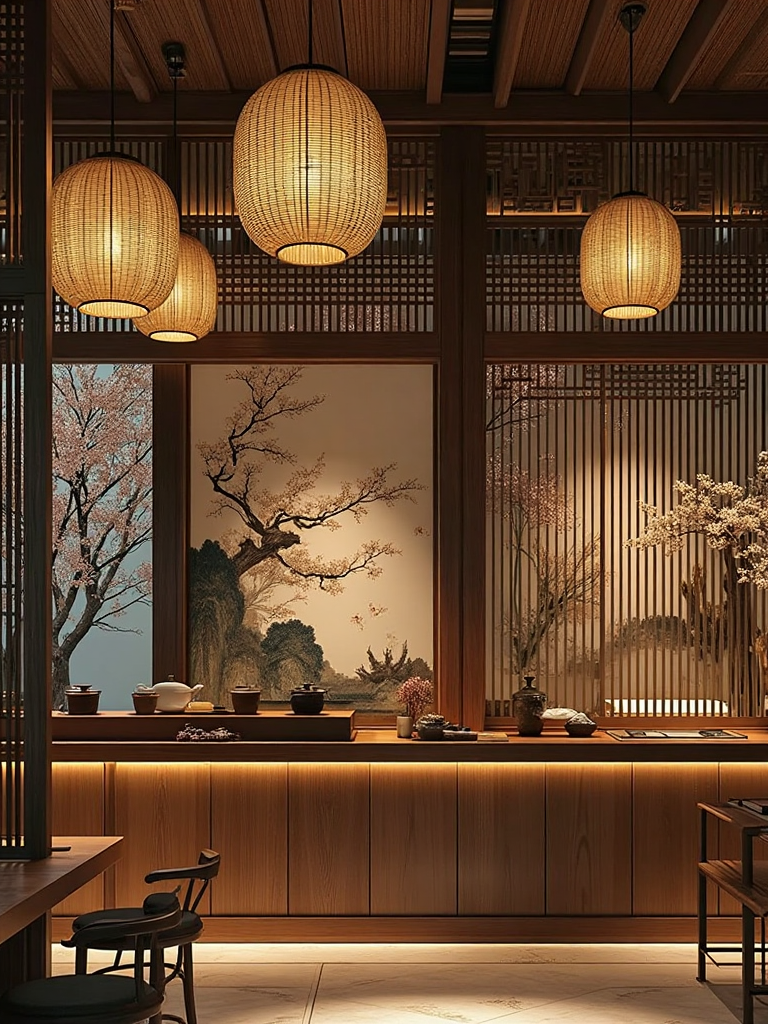 3. Traditional Japanese interior style, rice - paper lamps hanging from high ceilings, tatami - floored space, wooden shelves with pottery, a serene painted screen backdrop.