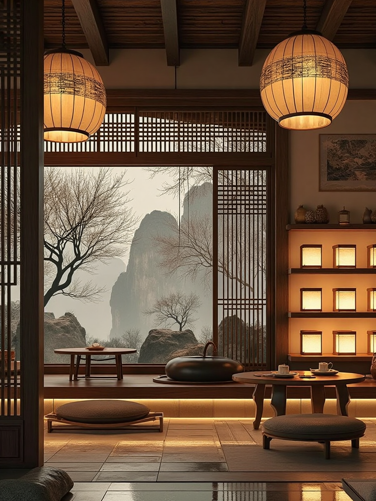7. Traditional Japanese interior style, tatami - based seating areas, shoji screens diffusing light, wooden lanterns on walls, a display of traditional tea sets, calm ambiance.