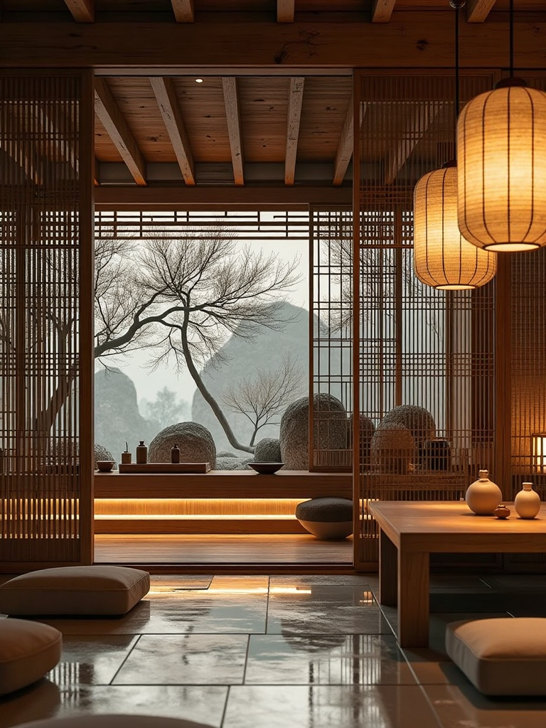 10. Traditional Japanese interior style, tatami mats, hanging paper lanterns, wooden lattice partitions, a view of a zen garden, understated yet elegant furniture.
