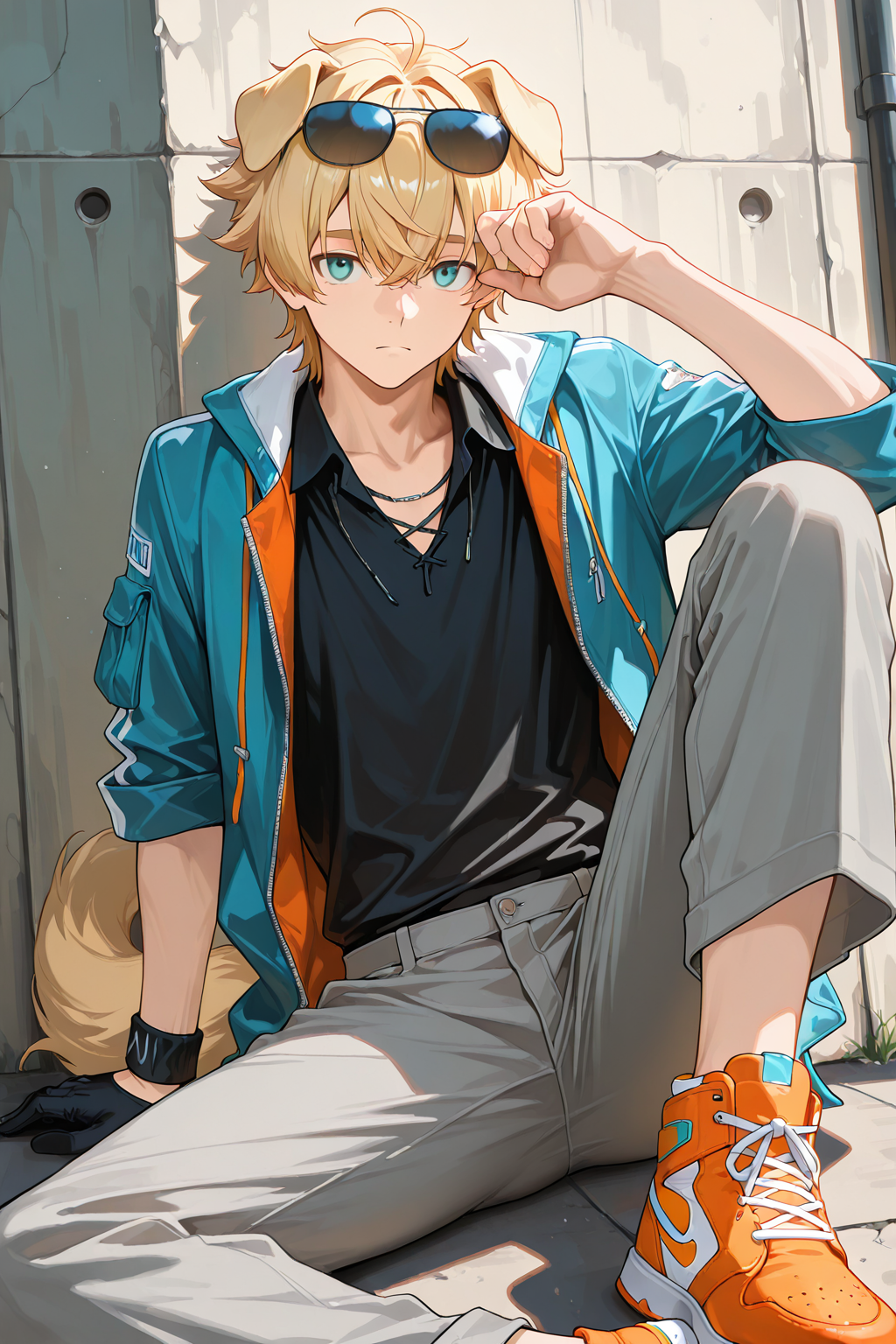 arknightstequila, blonde_hair, green_eyes, animal_ears, dog_ears, dog_boy, skin2, single_glove, jacket, grey_pants, black_shirt, sunglasses, orange_shoes, collared_shirt,