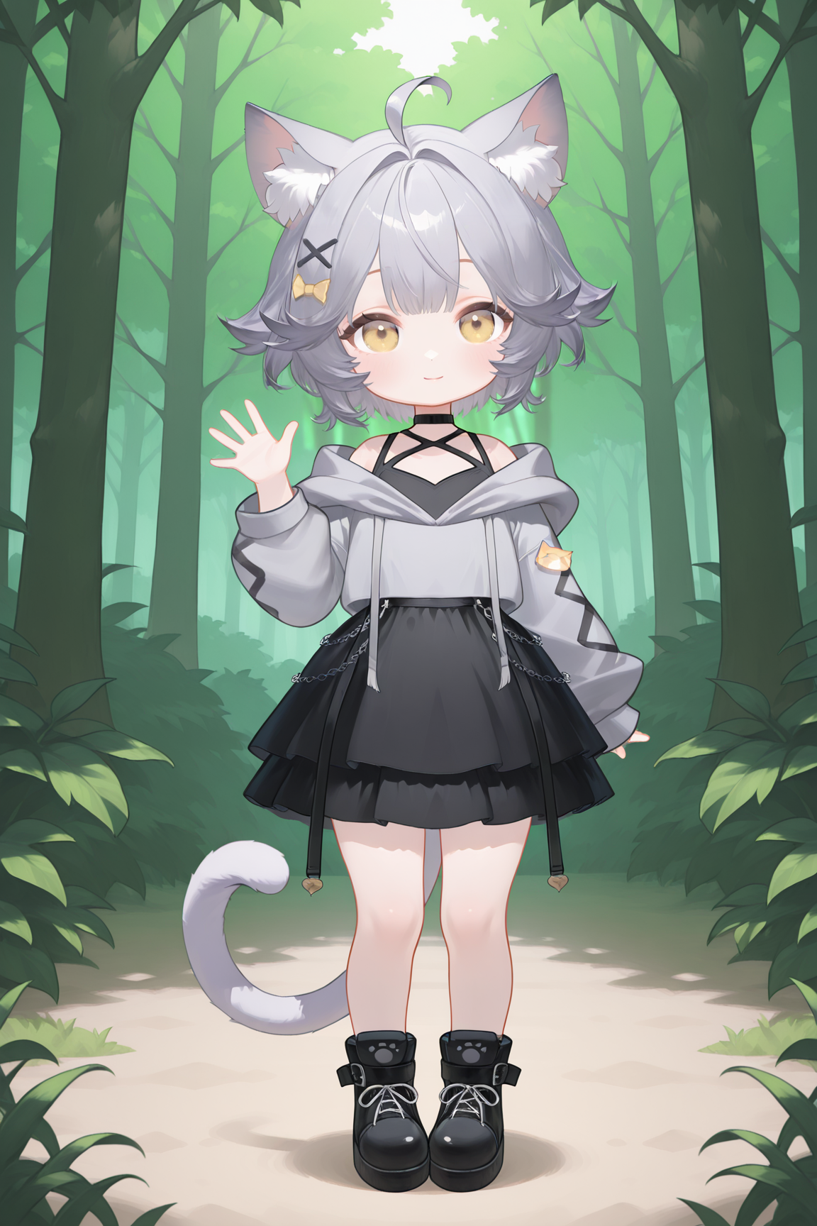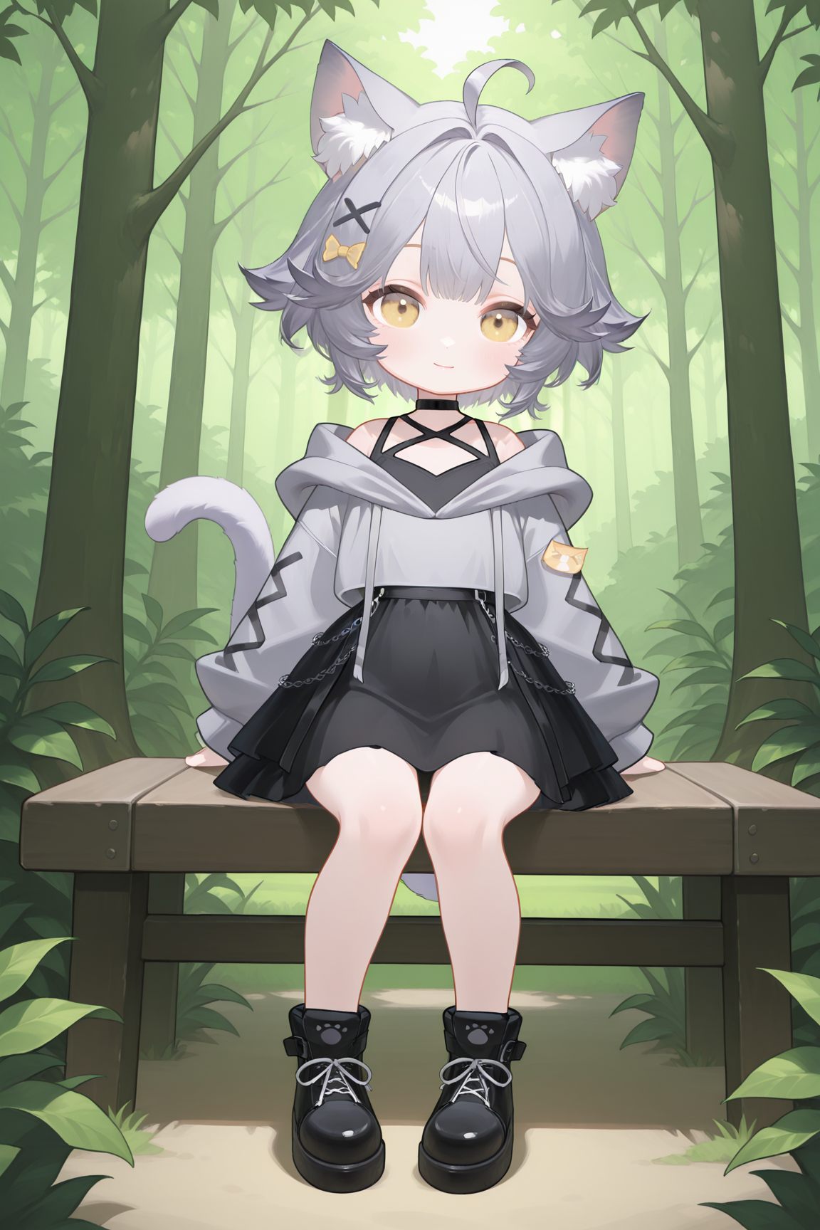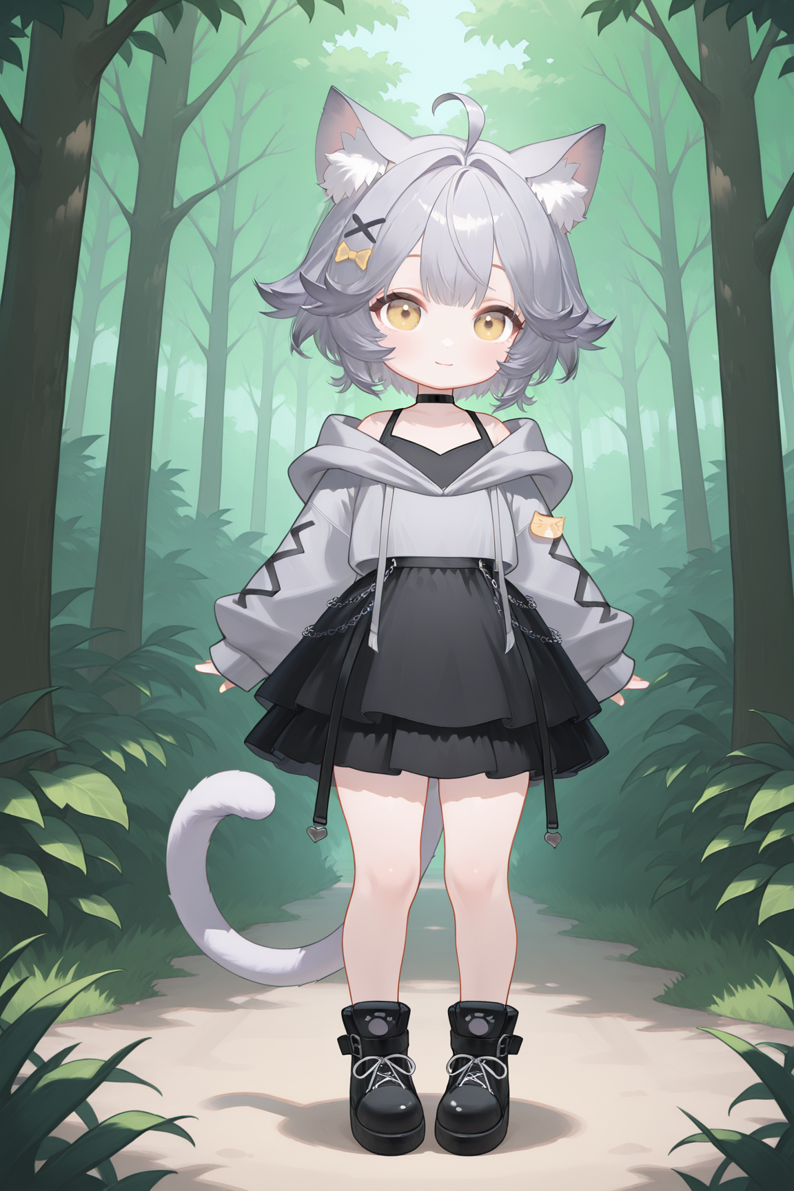 ➜ RasberSanVTILXL, yellow eyes, grey hair, short hair, bangs, ahoge, x hair ornament, yellow hair bow, cat ears, animal ear fluff, cat tail, flat chest, black choker, off shoulder, grey hoodie, long sleeves, black dress, black skirt, black footwear