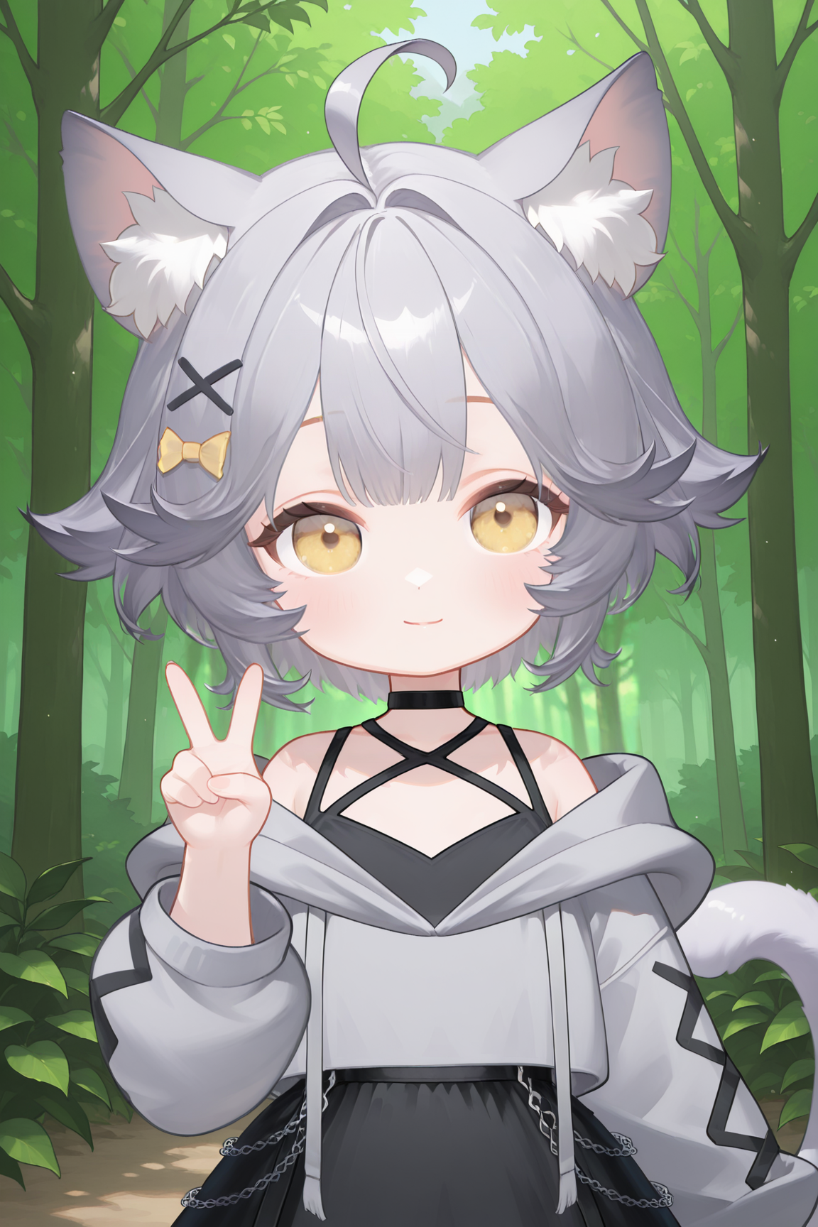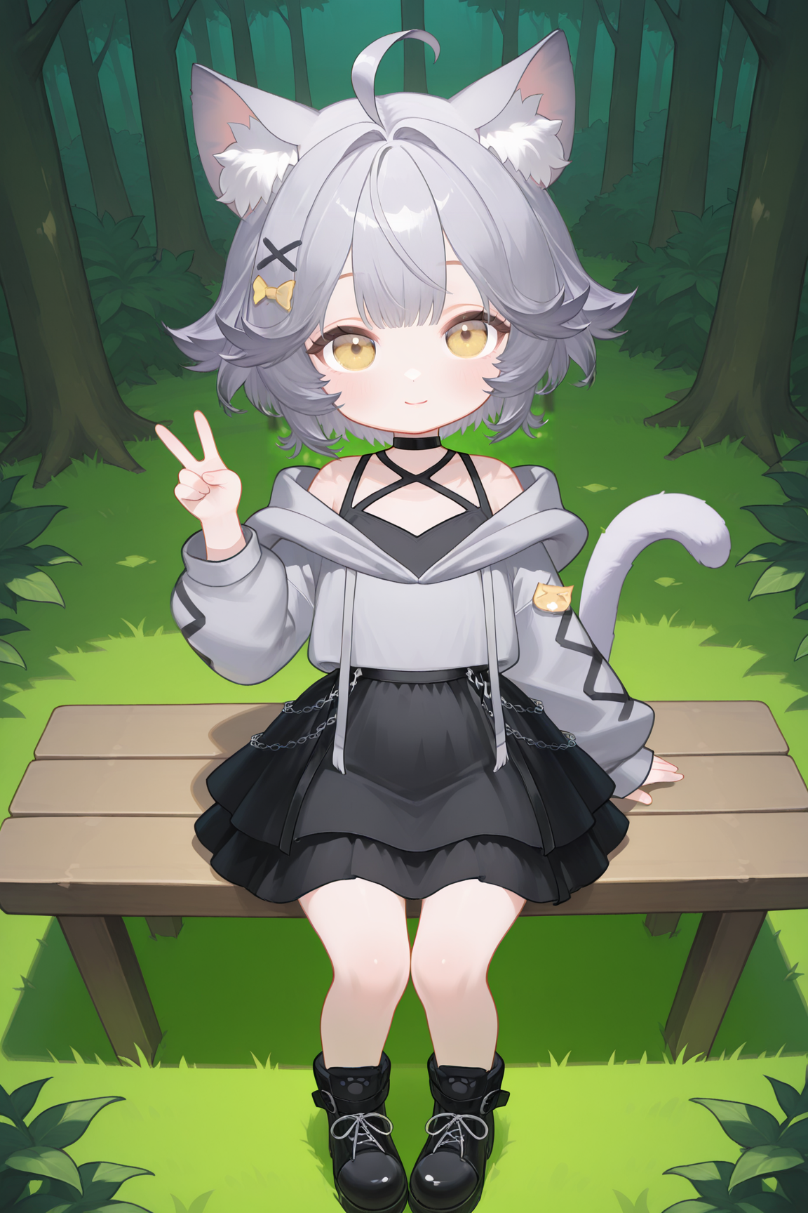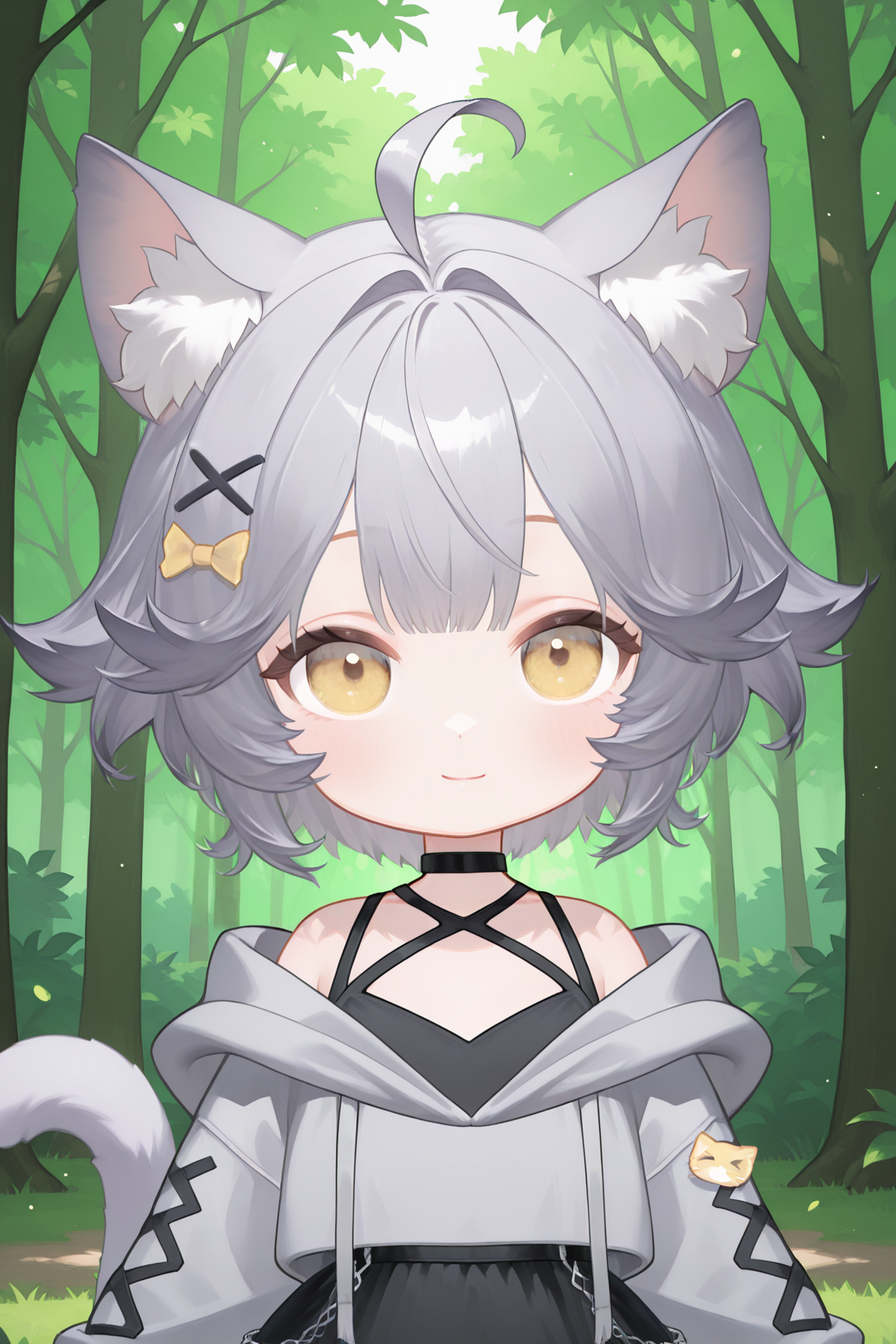 ➜ RasberSanVTILXL, yellow eyes, grey hair, short hair, bangs, ahoge, x hair ornament, yellow hair bow, cat ears, animal ear fluff, cat tail, flat chest, black choker, off shoulder, grey hoodie, long sleeves, black dress, black skirt, black footwear