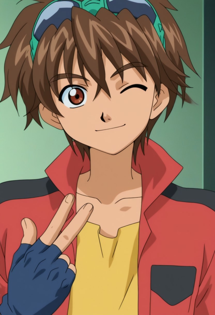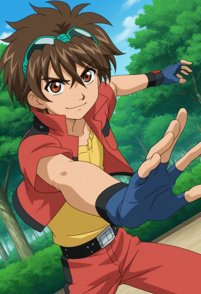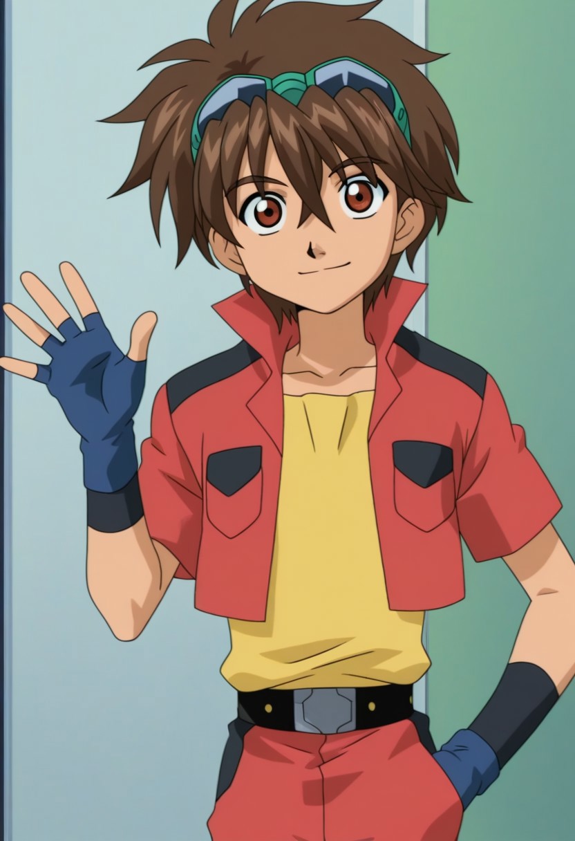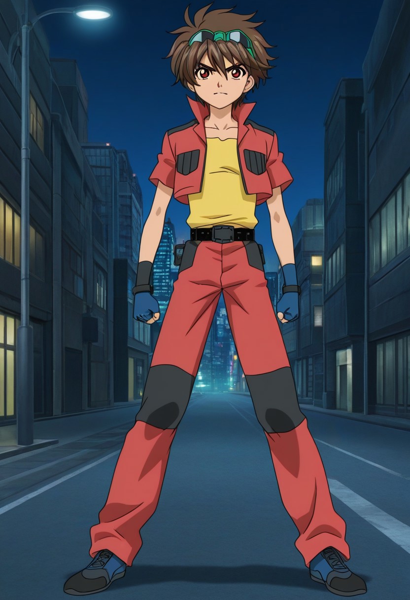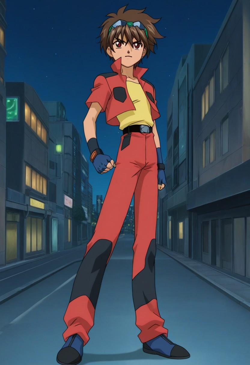 Dan Kuso, brown hair, green goggles on head, brown-red eyes, red open jacket, popped collar, cropped jacket, short sleeves, black accents, yellow undershirt, blue fingerless gloves, belt, red pants, black and blue shoes