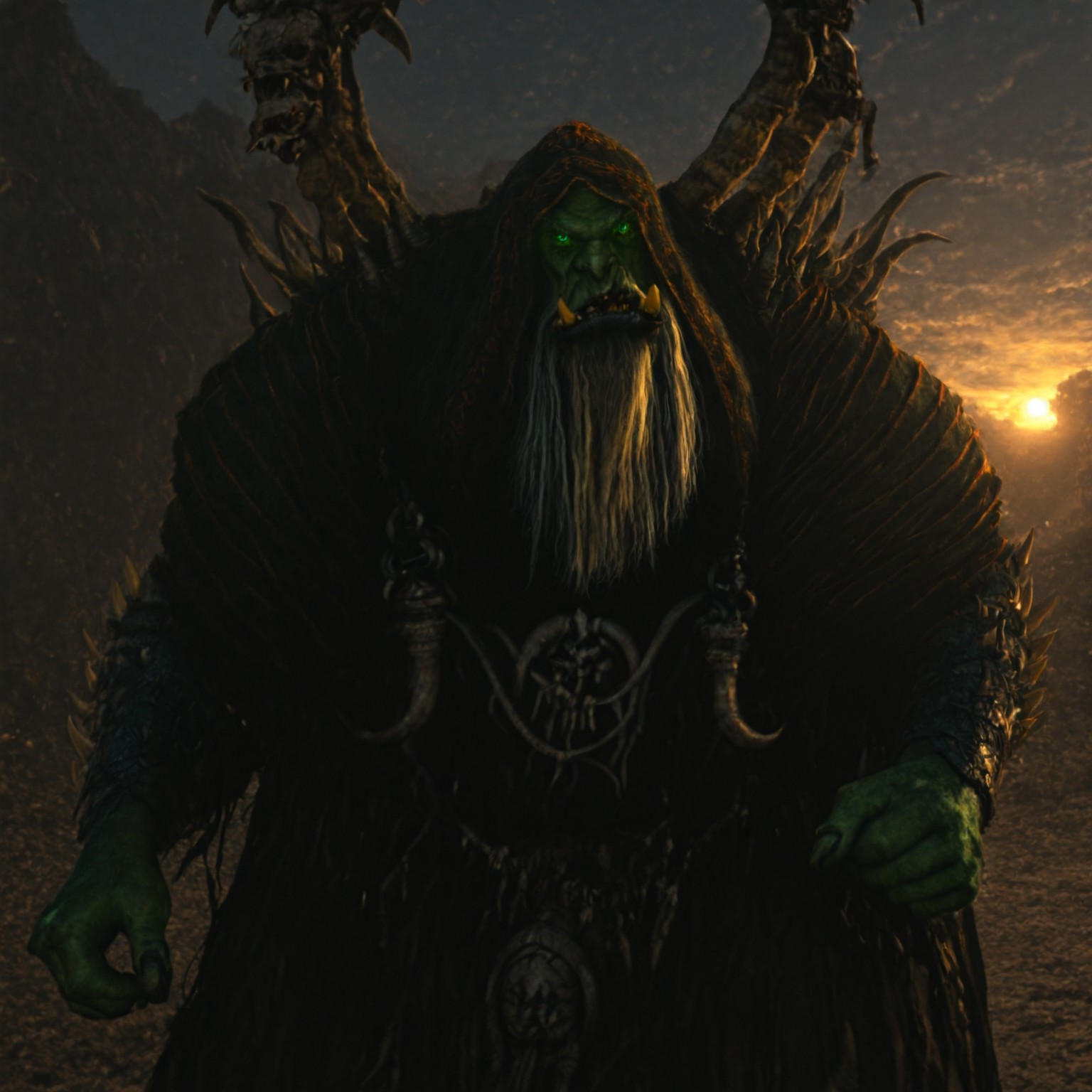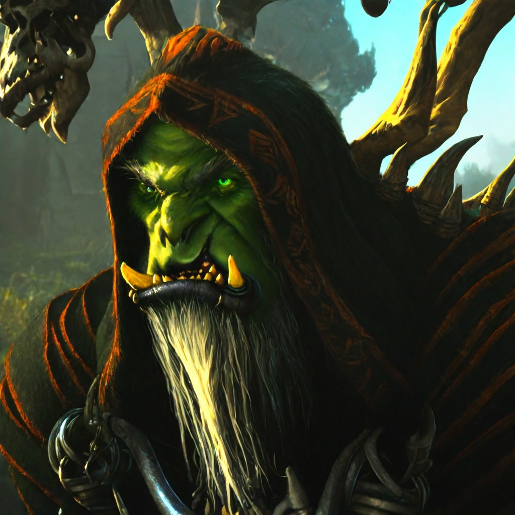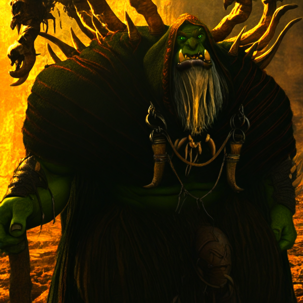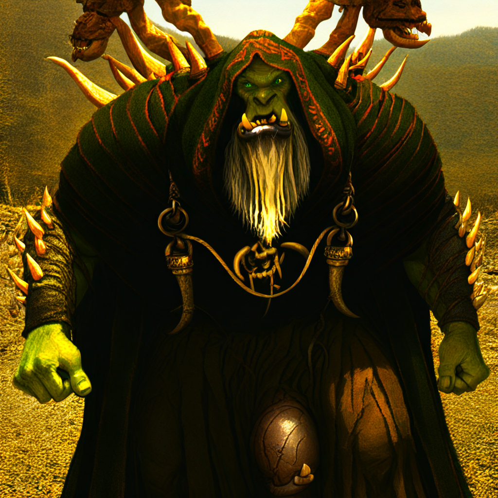 Gul'dan, old, male, orc, green eyes, beard, white hair, bald, tusks, fangs, wrinkles, green skin, tusk piercing, lip piercing, tattered robes of leather and cloth, bone spikes, hunched, bara, strong jawline, heavy brow ridge, Wide jaw, broad nose, rugged, giant,