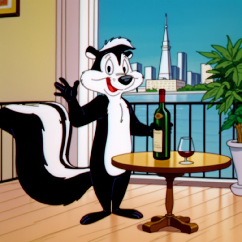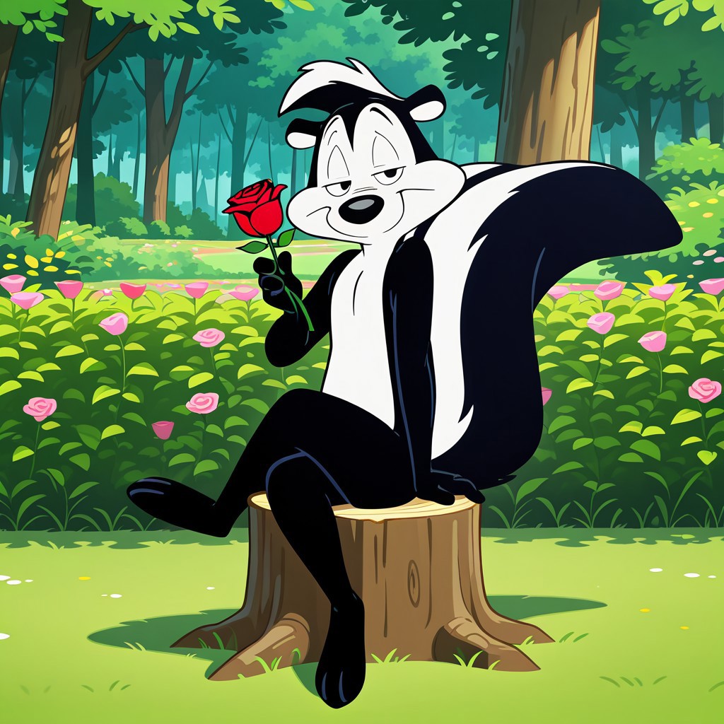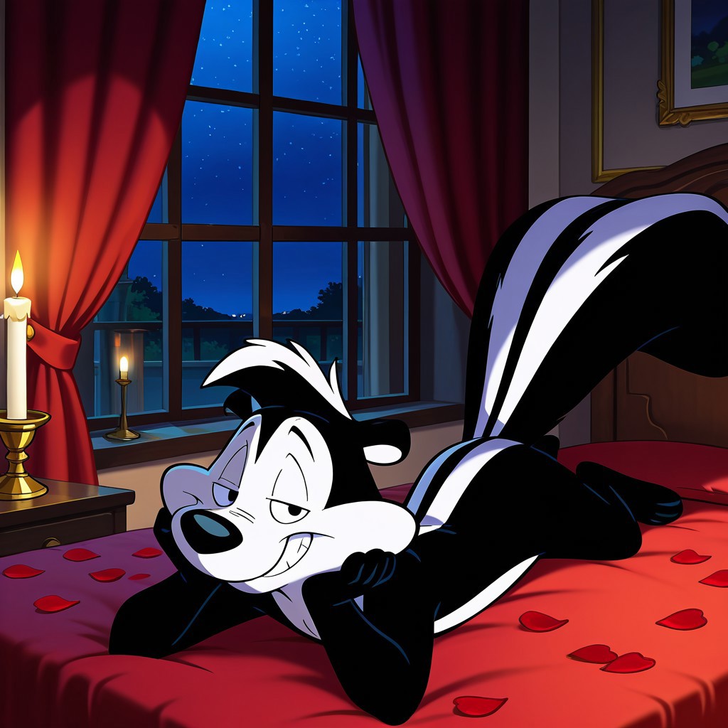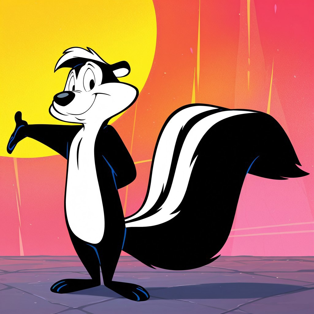 Tags: Pepelepew, furry male, skunk, black fur, white fur, two-tone fur, black eyes, black nose, tail,